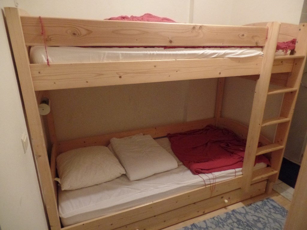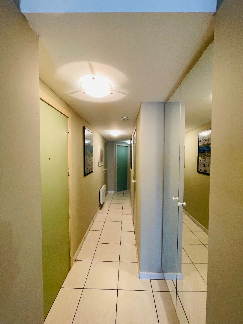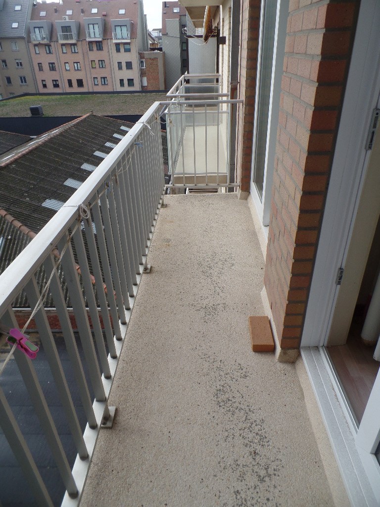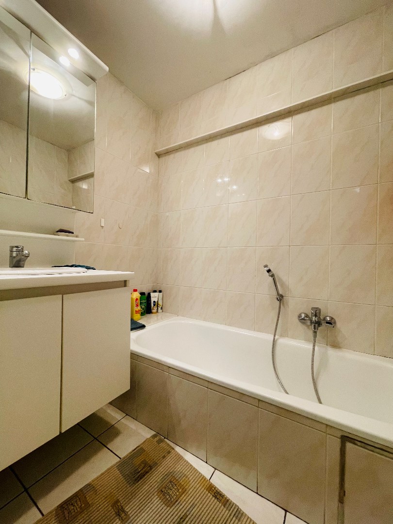 Hall d'entrée, living avec terrasse, cuisine ouverte équipée avec débarras, 2 chambres avec balcon, 1 chambre avec salle de douche, salle de bain avec baignoire et lavabo et une toilette séparée..