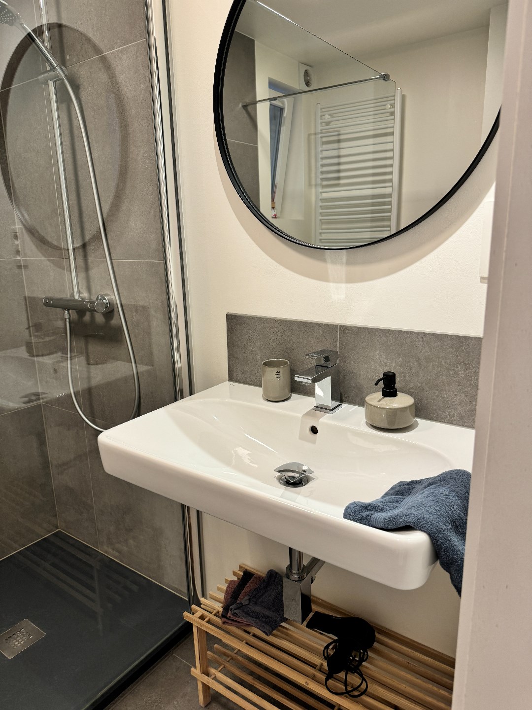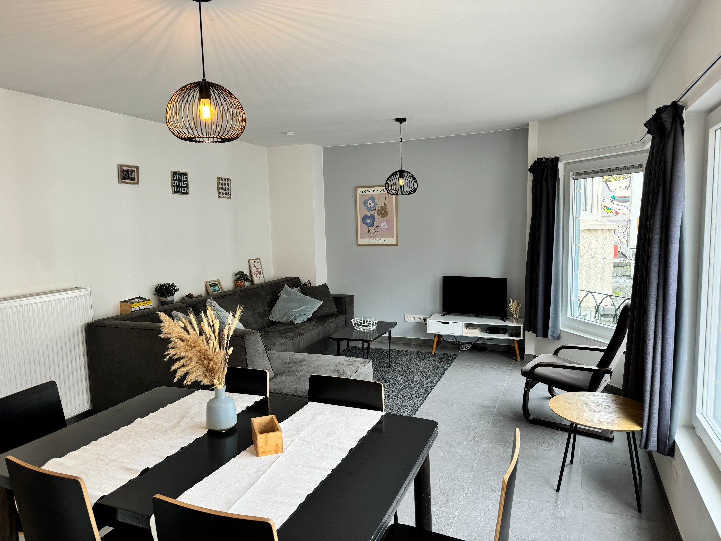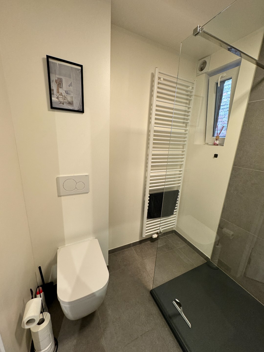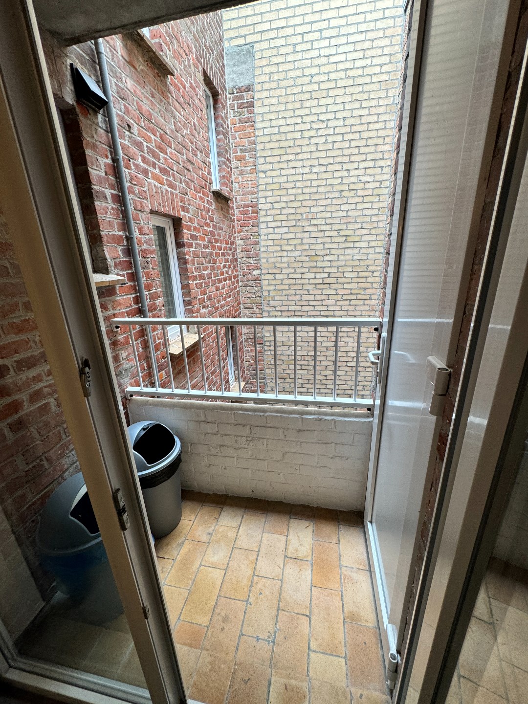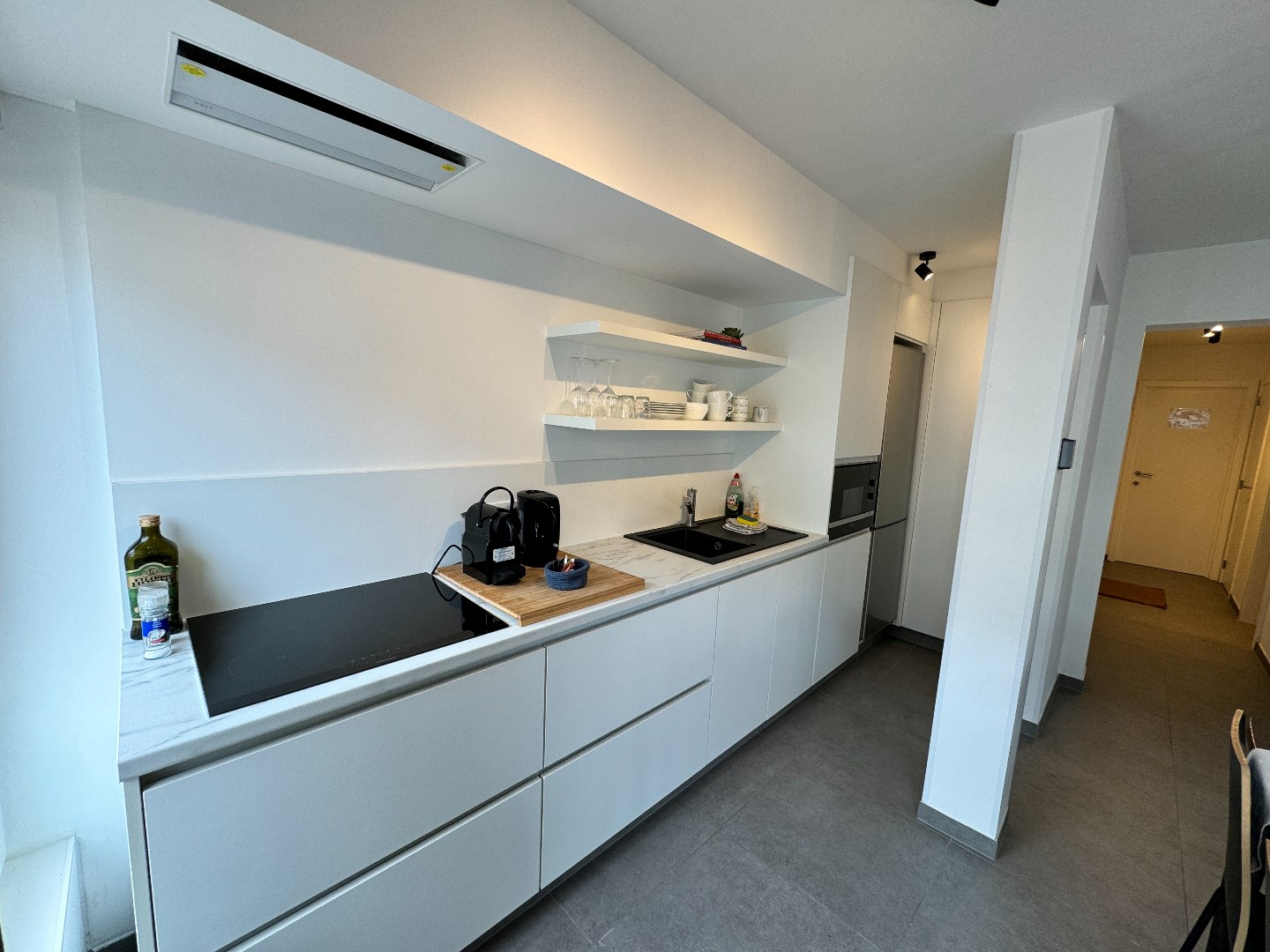 Hall d'entrée, living éclairé avec un cuisine ouverte et équippé, chambré avec balcon et salle de bains avec douche et toilette.