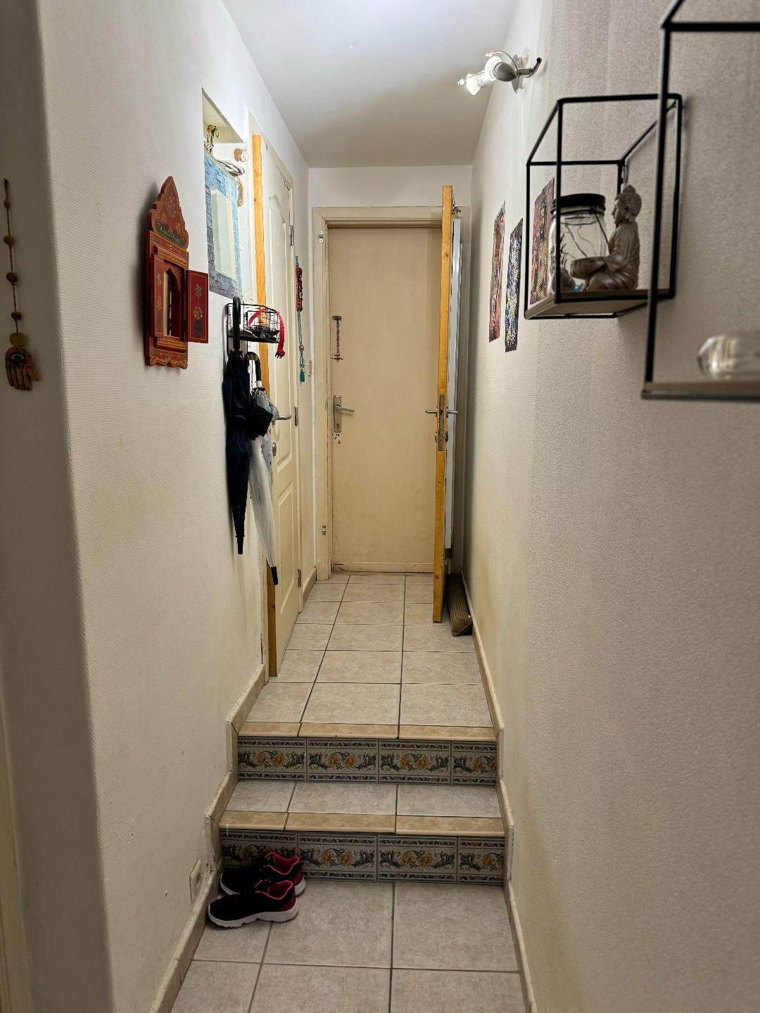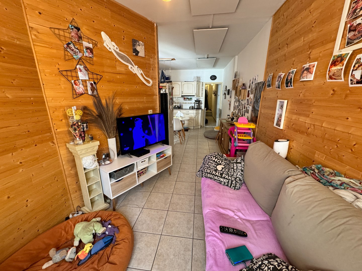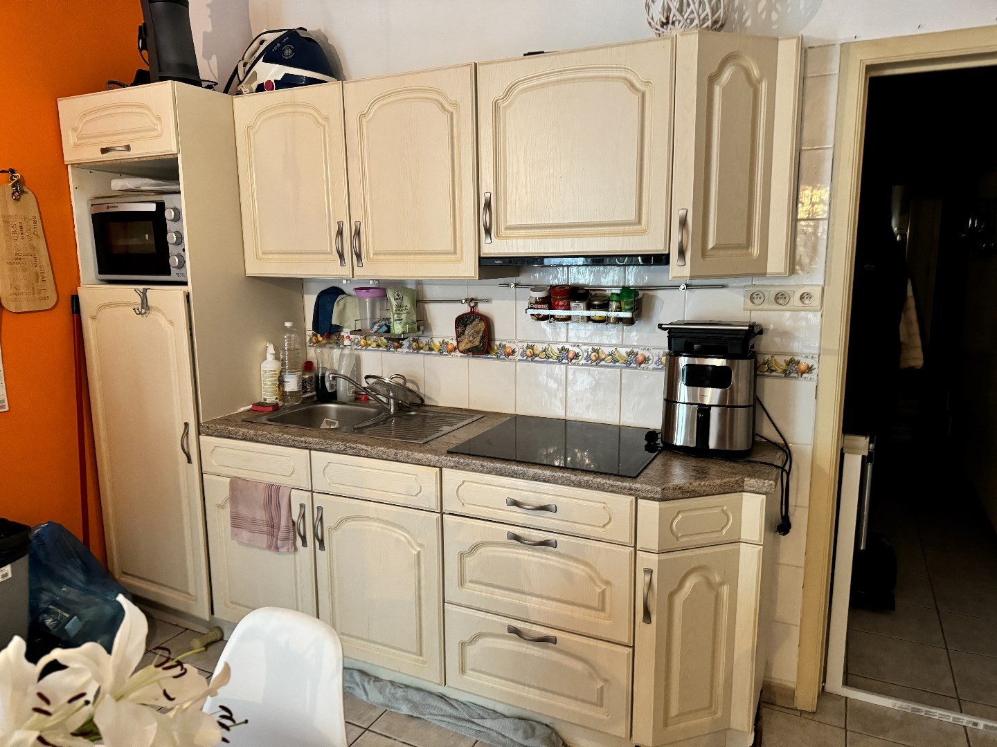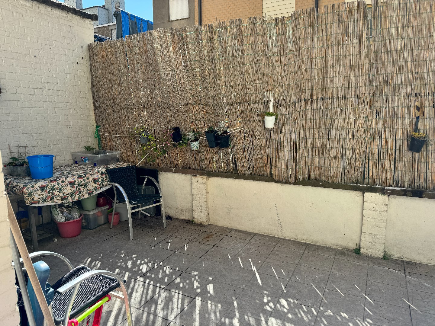 Hall d'entrée, salon avec cuisine ouverte, 1 chambre, salle de bains avec douche, lavabo et raccordement pour une machine à laver, toilette séparée, cour spacieuse orientée vers le soleil et une cave privative.