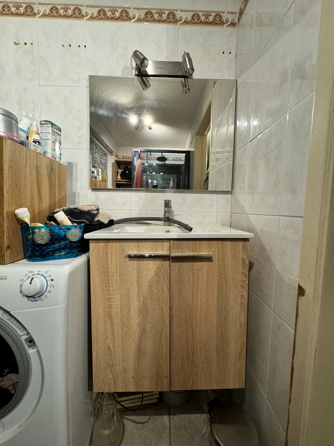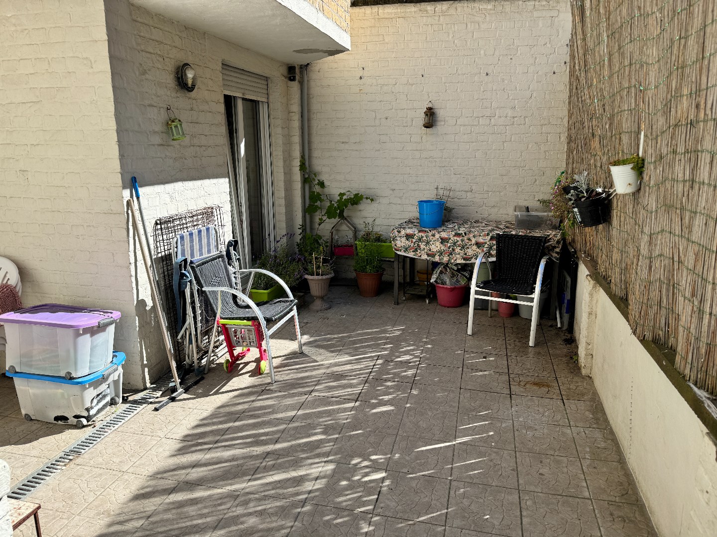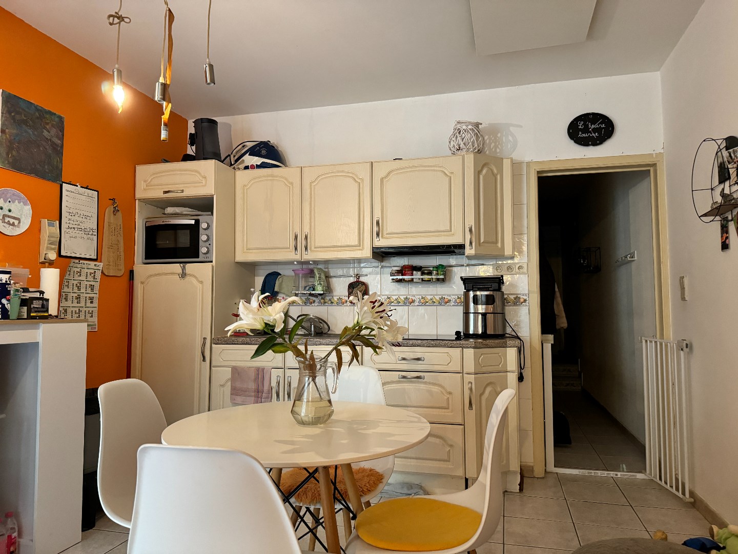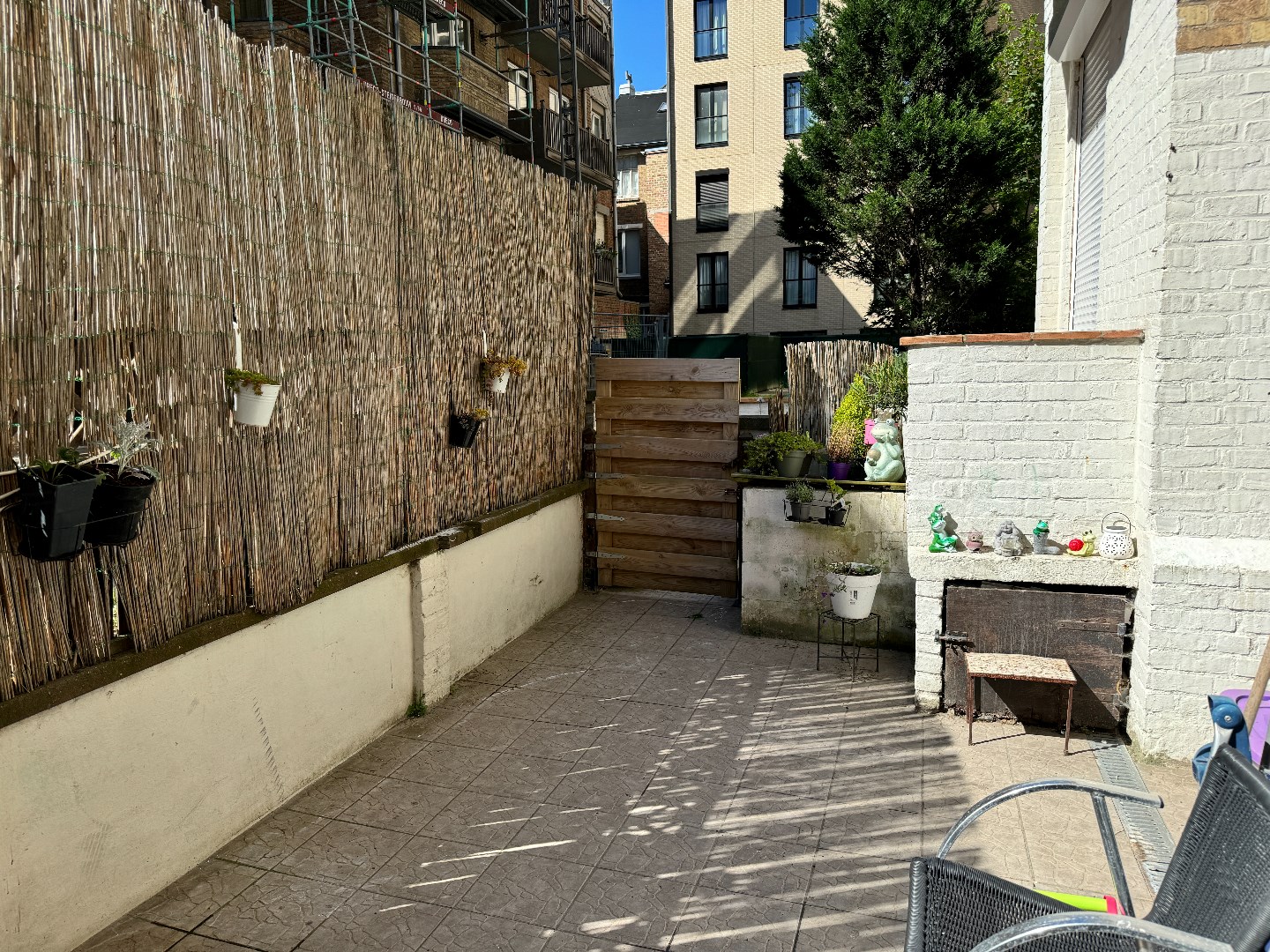 Hall d'entrée, salon avec cuisine ouverte, 1 chambre, salle de bains avec douche, lavabo et raccordement pour une machine à laver, toilette séparée, cour spacieuse orientée vers le soleil et une cave privative.
