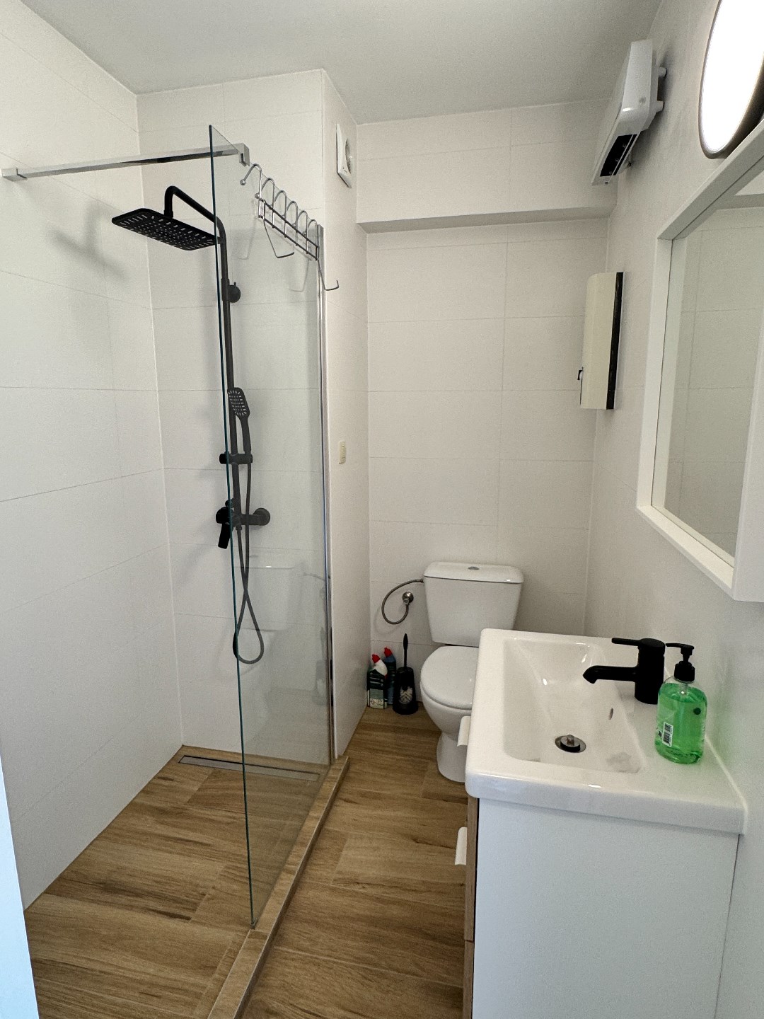Hall d'entrée, salon avec terrasse ensoleillée, cuisine ouverte, 1 chambre, salle de bains avec douche à l'italienne, lavabo et toilette.