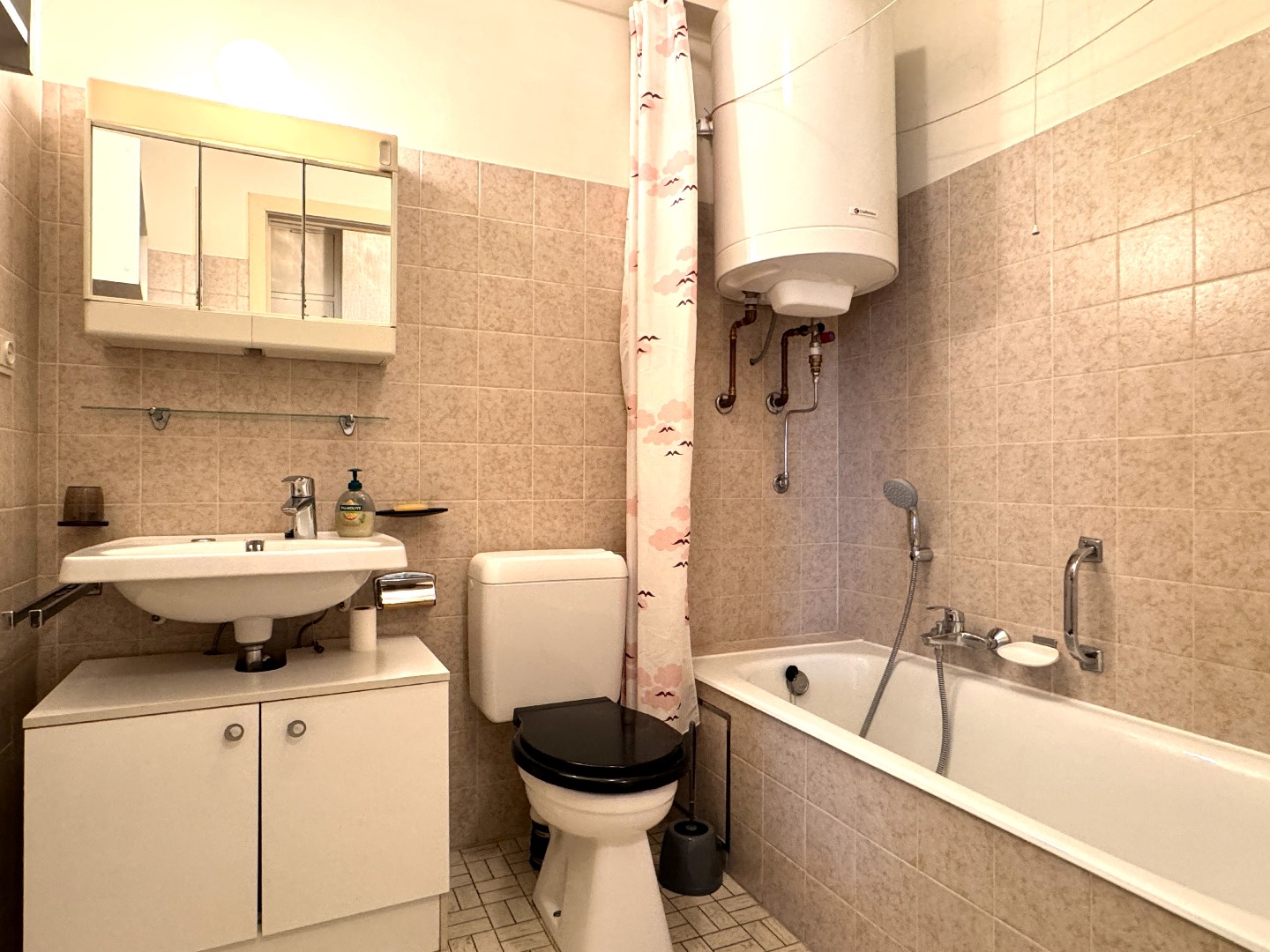 Hall d'entrée avec vestiaire, salon avec cuisine ouverte, terrasse ensoleillée, 1 chambre à coucher, salle de bain avec lavabo, baignoire et toilette et un débarras au sous-sol.
