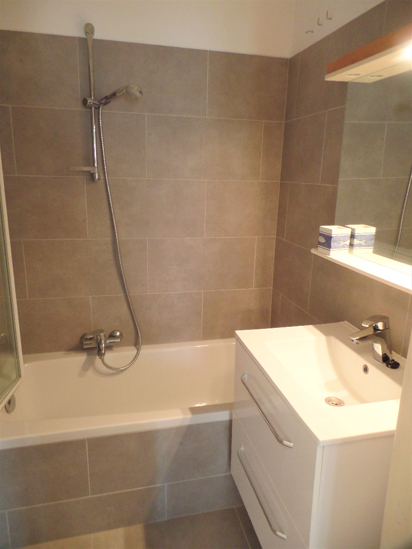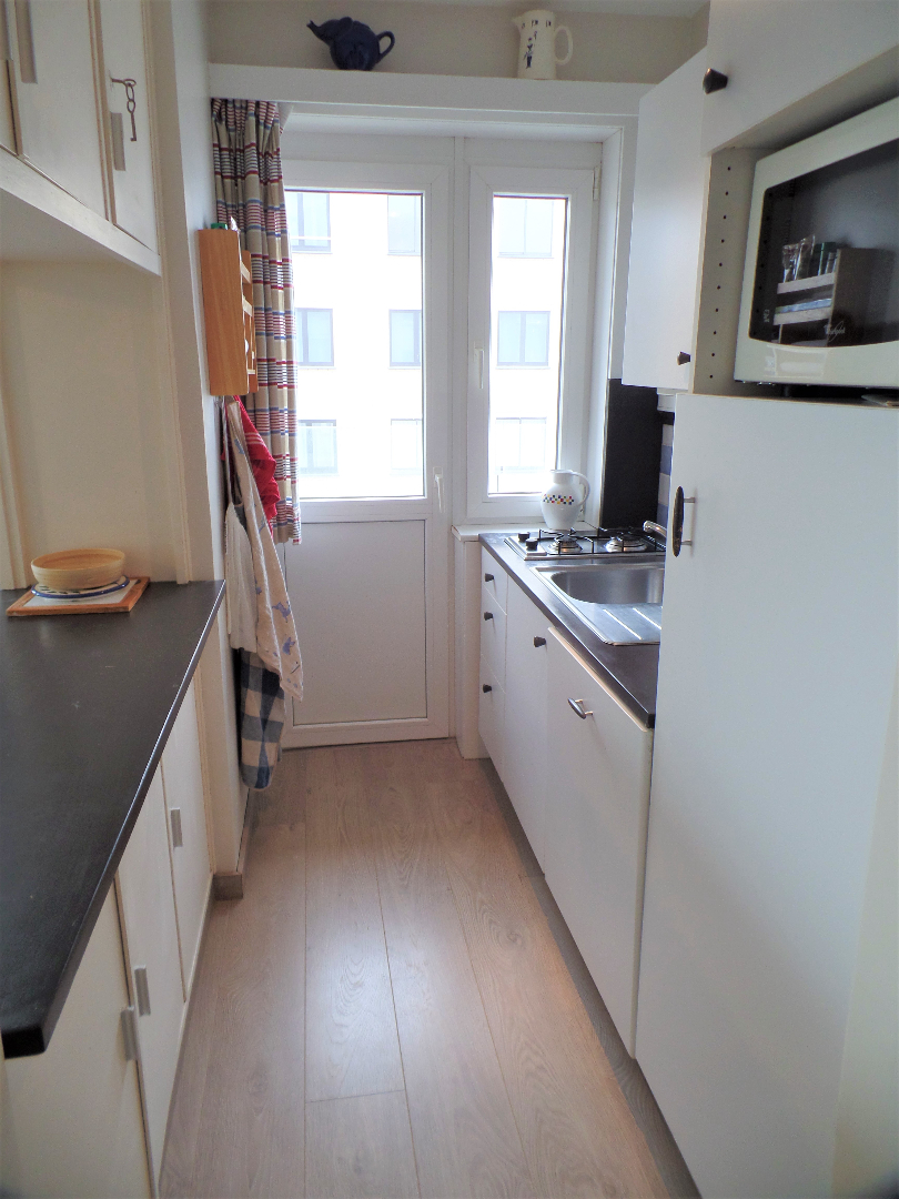 Entrée, living lumineux avec cuisine semi-ouverte, terrasse avec vue sur mer, 2 chambres à coucher, salle de bains avec baignoire et lavabo, toilette séparée avec débarras et une grande cave privative.