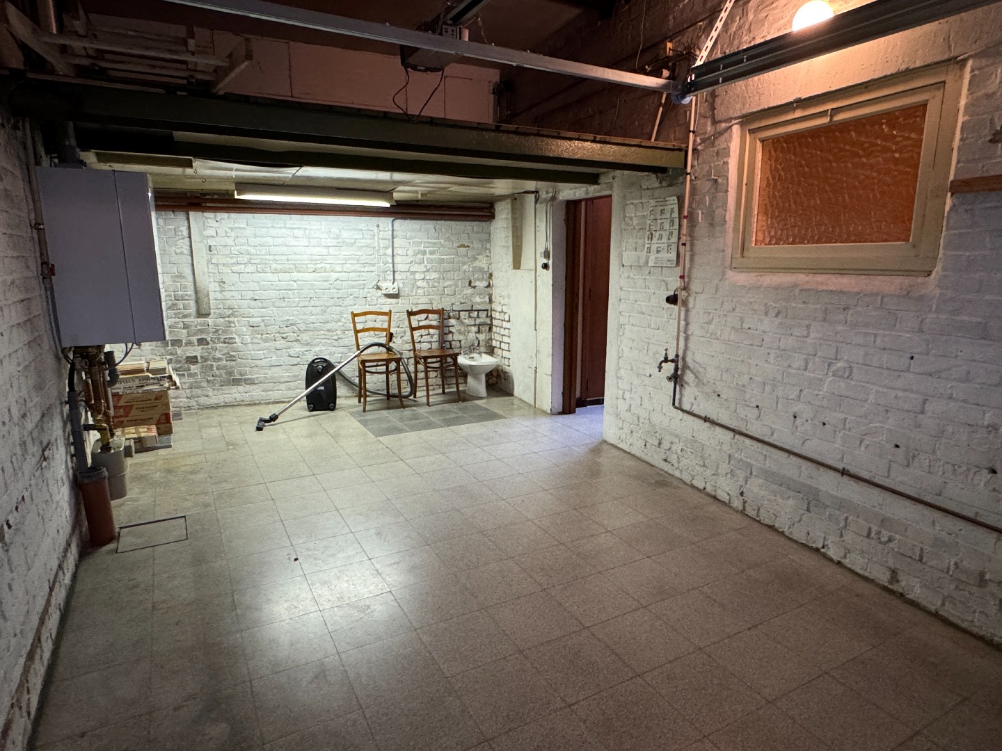 Premier étage (65m²) : hall d'escalier avec placard, living lumineux, cuisine avec petit balcon, 1 chambre à coucher, salle de bains avec douche, lavabo, toilette et raccordement pour une machine à laver.