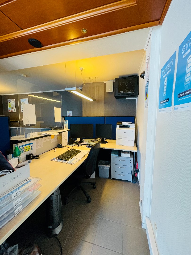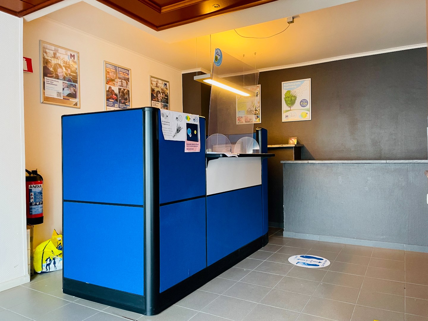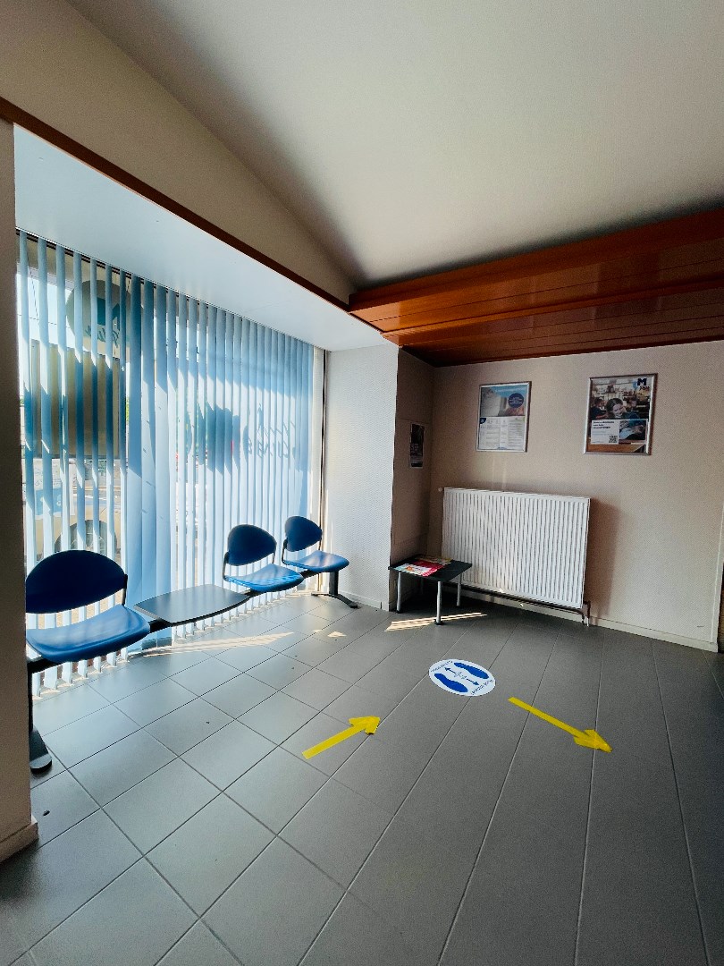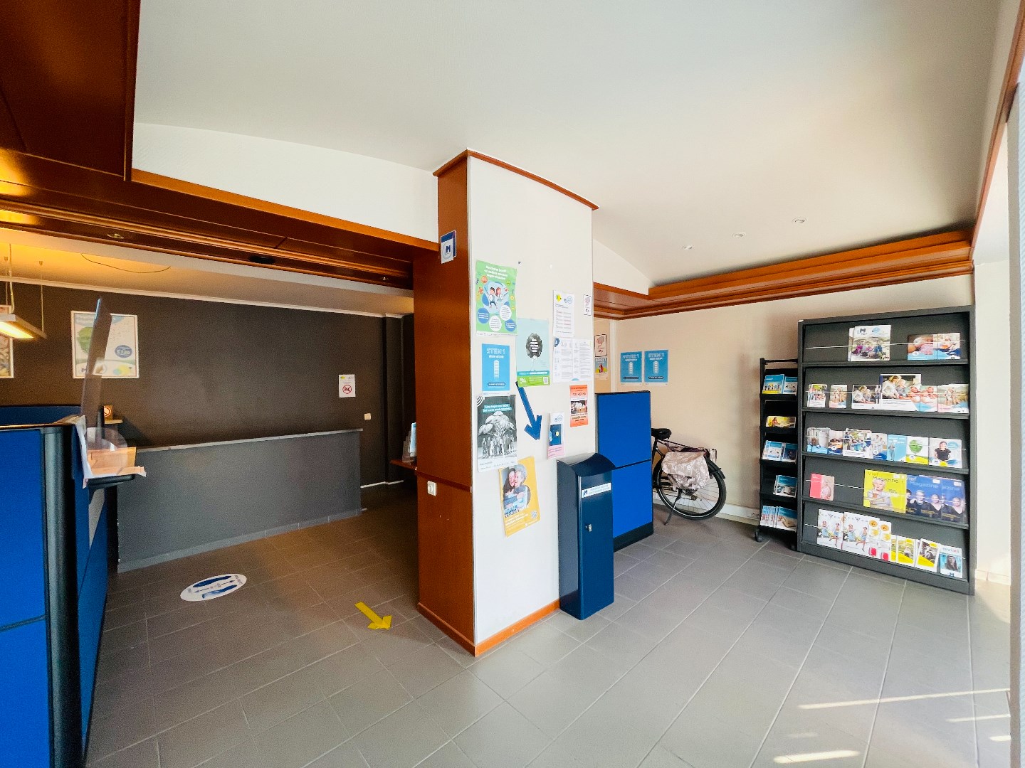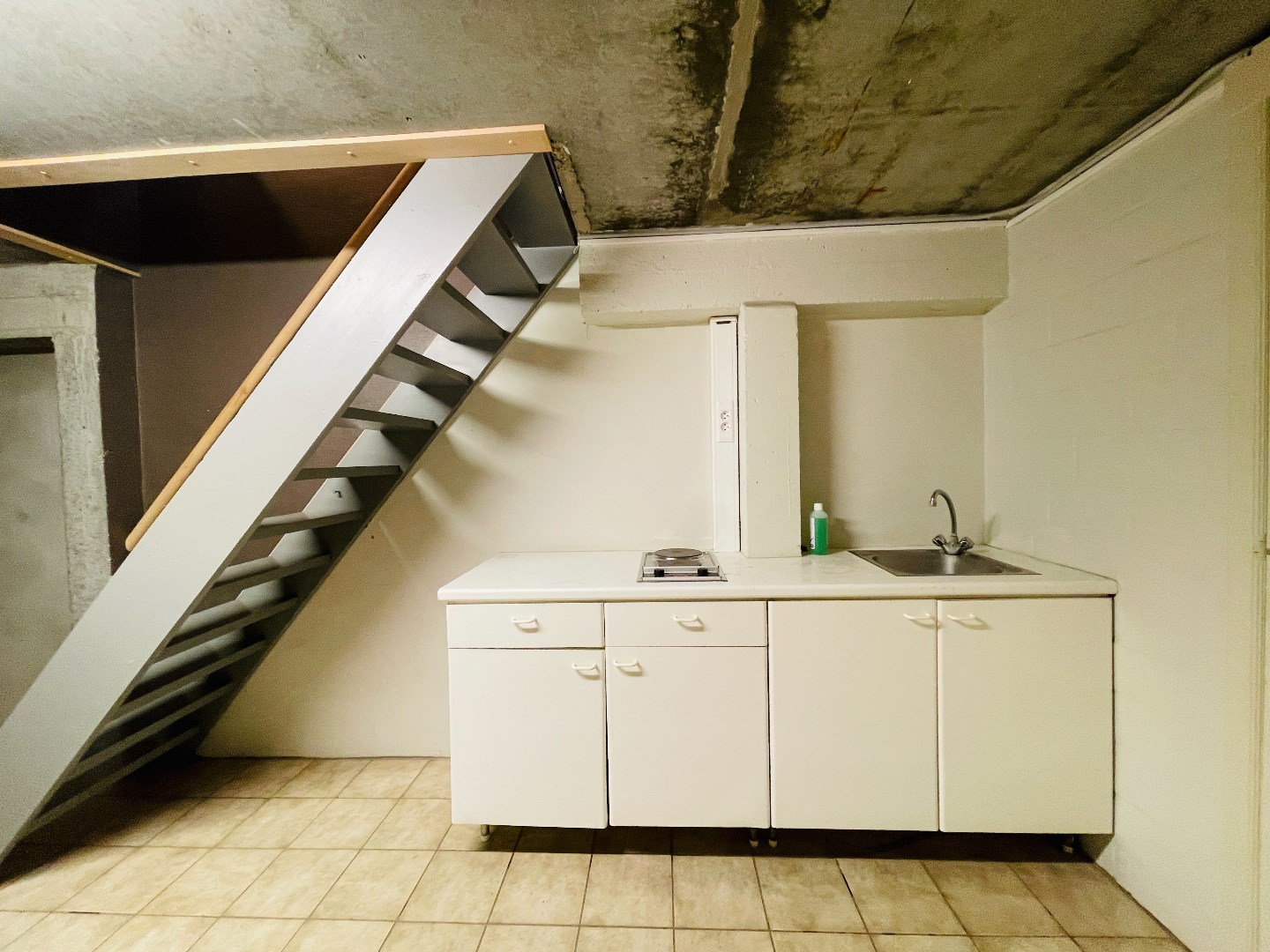 Local commercial au rez-de-chaussée avec un escalier menant au sous-sol avec espace de stockage et toilette.