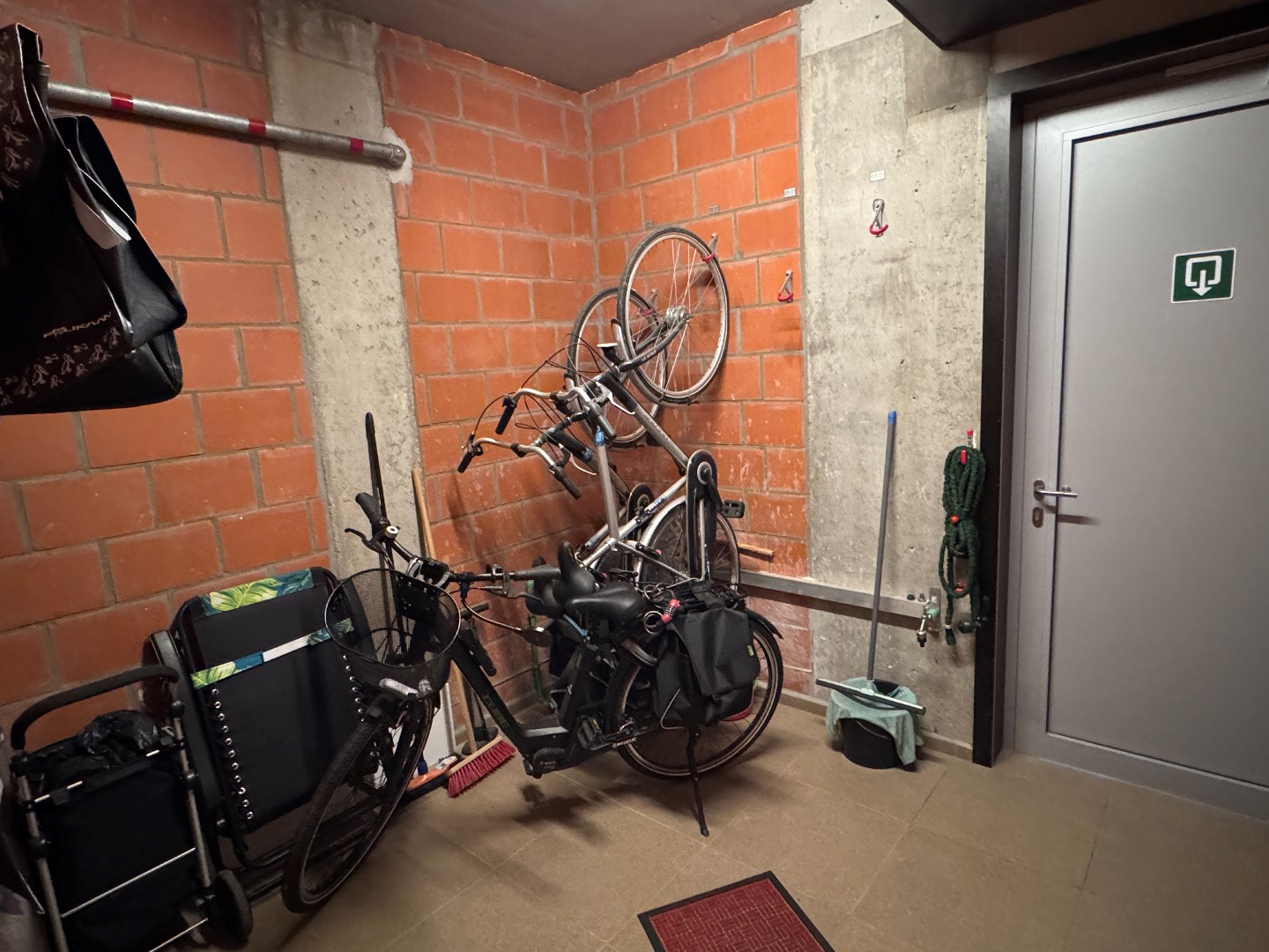 Rez-de-chaussée: Grand cave privative (± 6,09m²) avec raccordement pour machine à laver sur eau de pluie et 2 crochets à vélo dans le local à vélos commun.