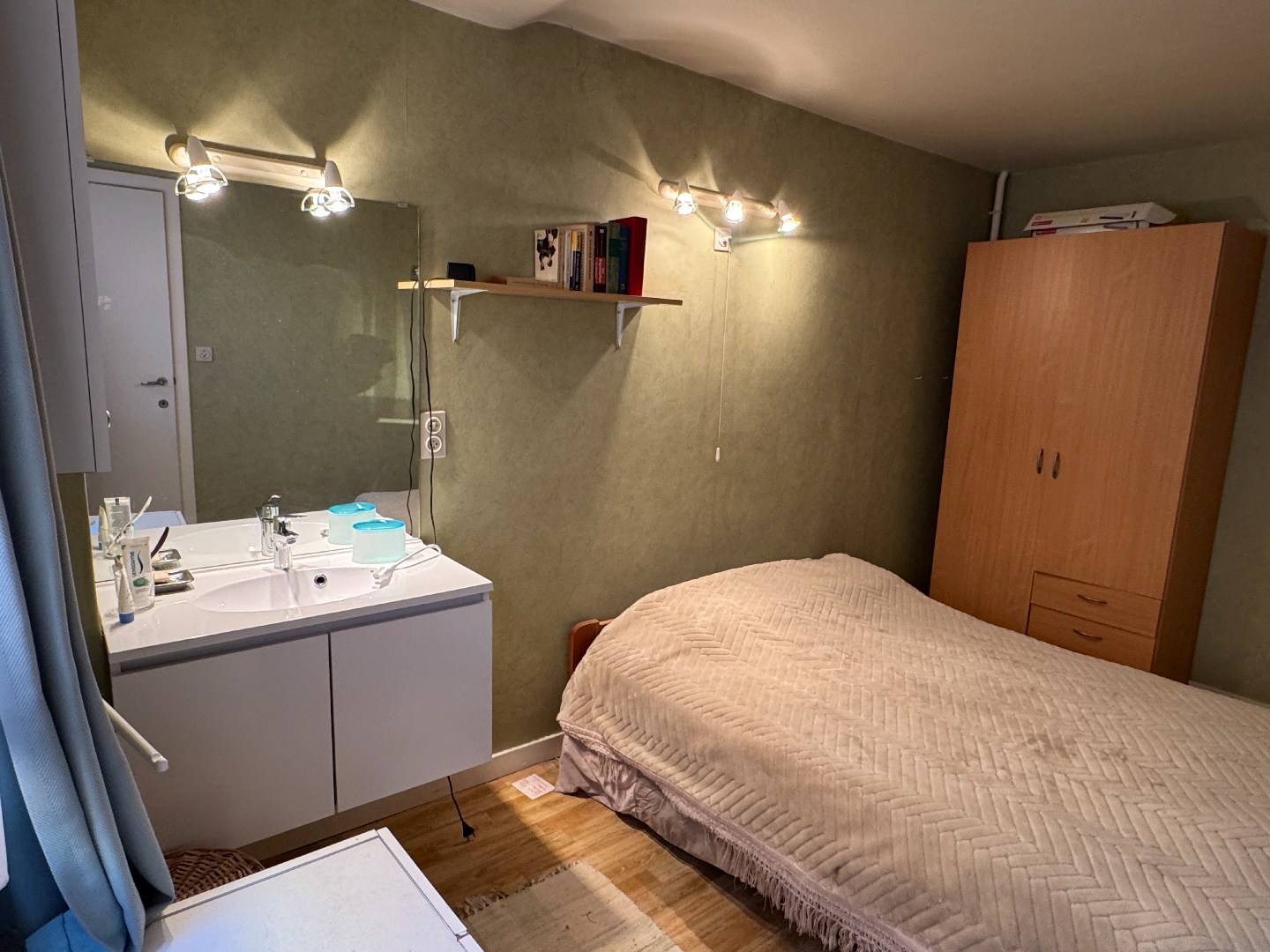 Salon lumineux, cuisine, 1 chambre avec lavabo, salle de bains avec douche et toilette et une partie dans la cave commune.