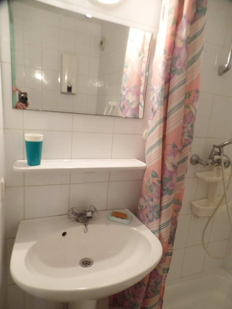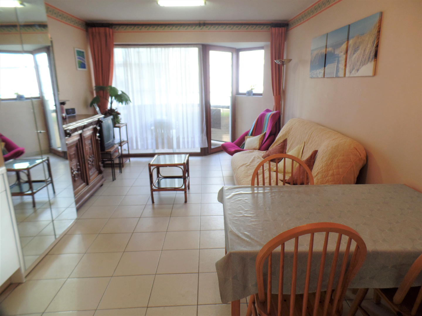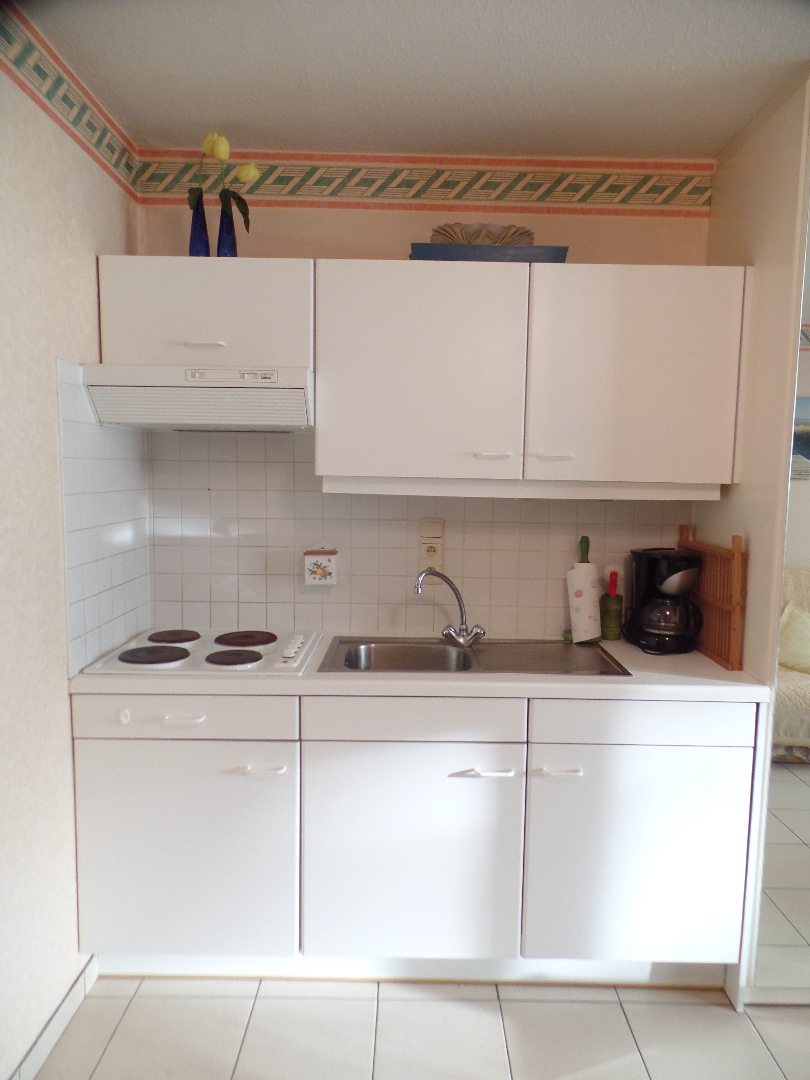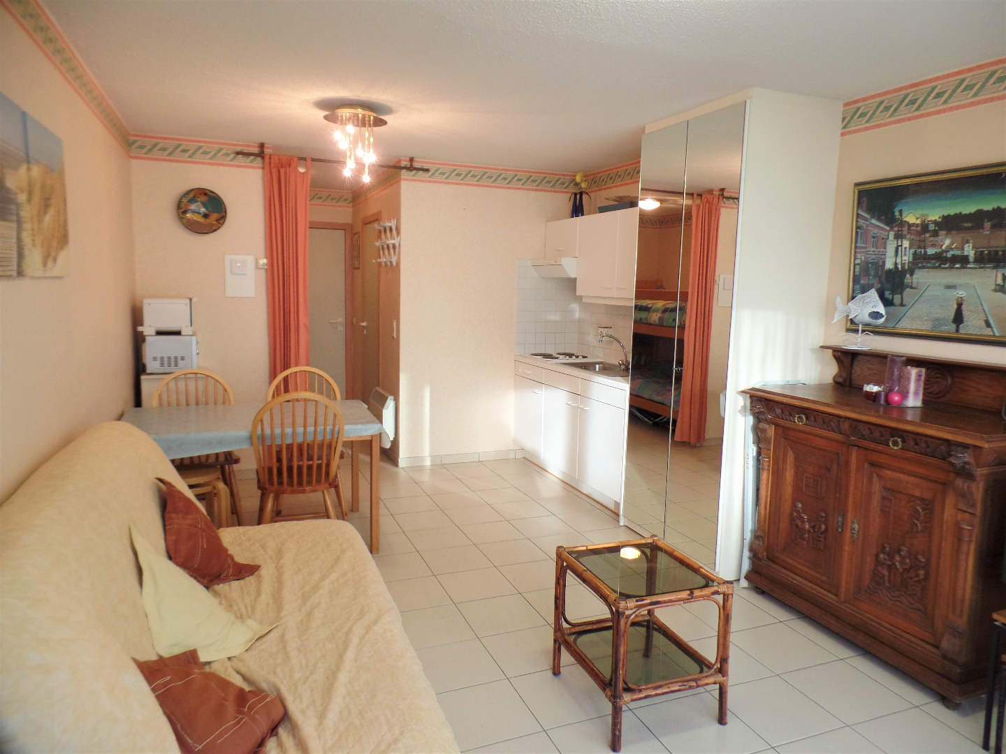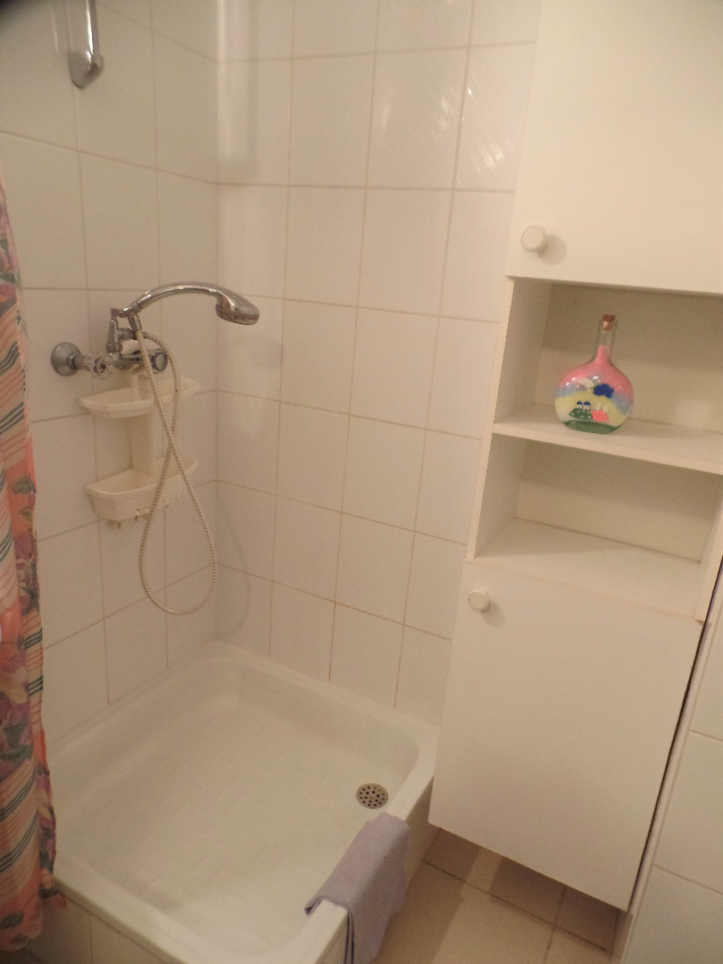 Entrée spacieuse, living avec terrasse, cuisine ouverte, salle de bains avec douche, lavabo et toilette.