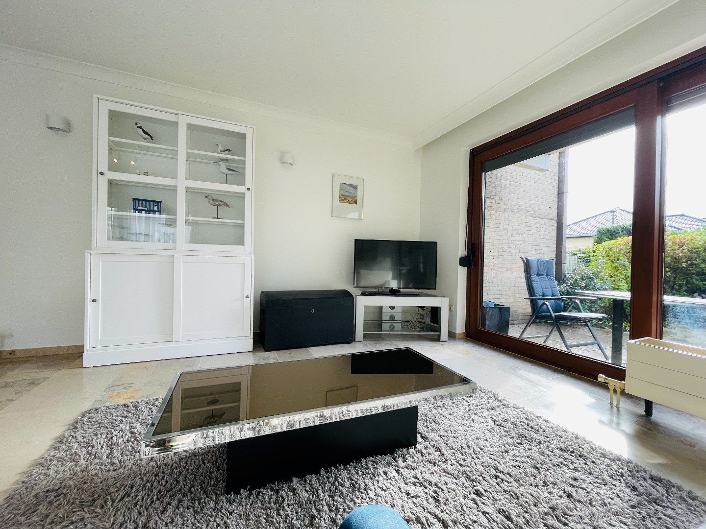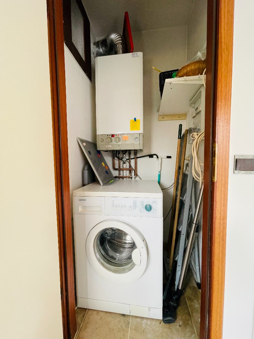 Inkomhal, woonkamer, ingerichte open keuken met berging en aansluiting voor een wasmachine, 1 slaapkamer, badkamer met douche en dubbele wastafel, apart toilet, balkon, ruime zongerichte koer en een grote garage.