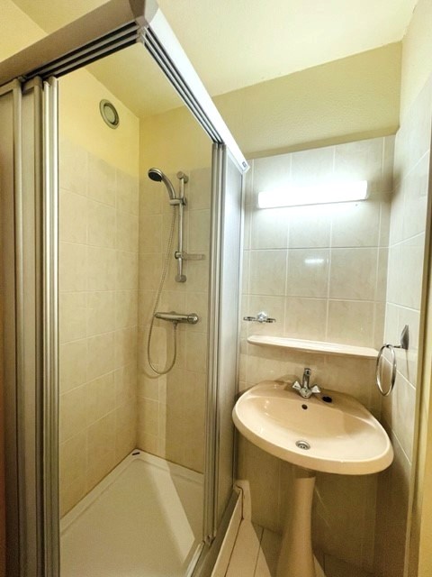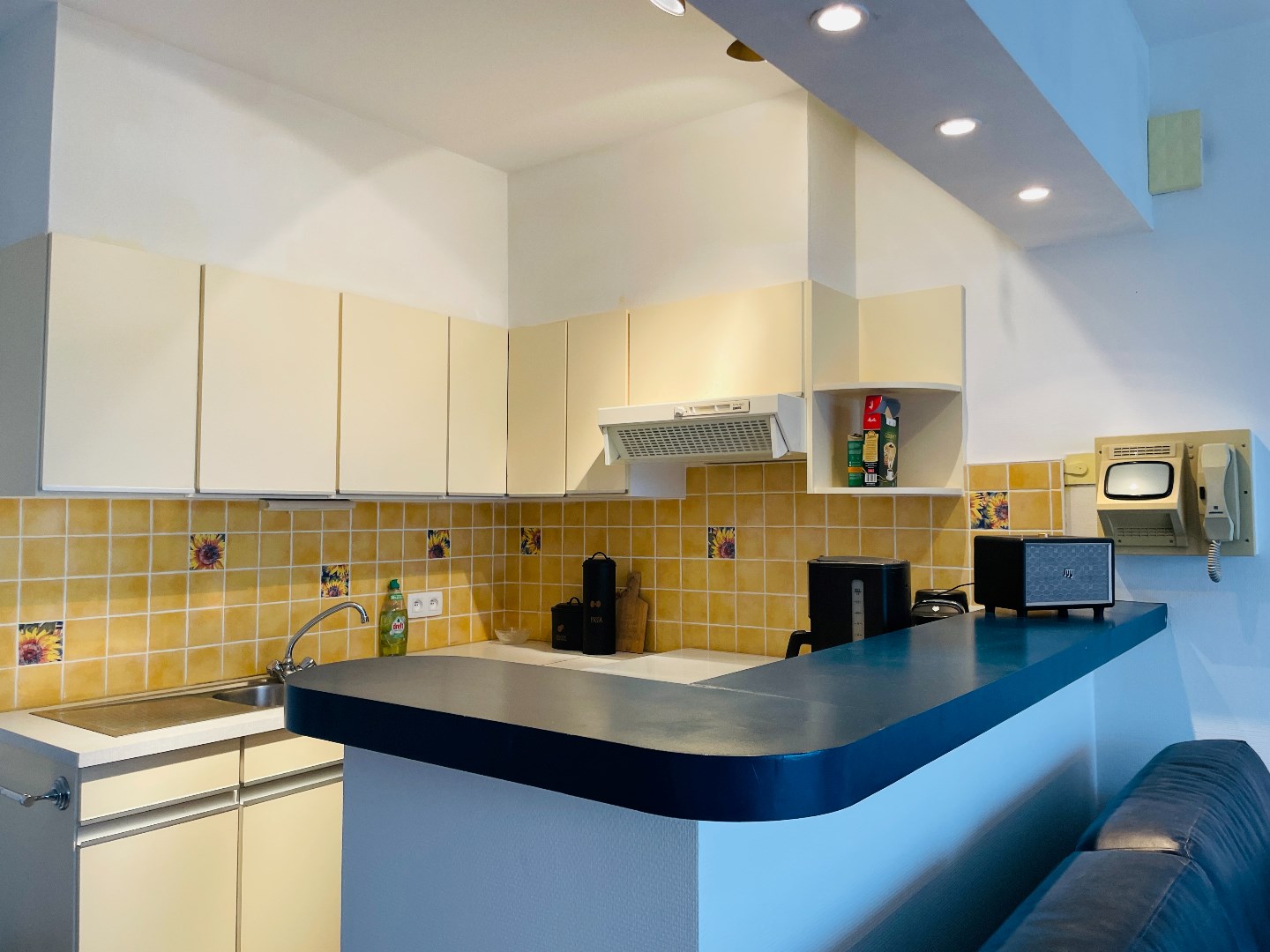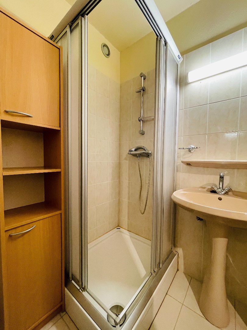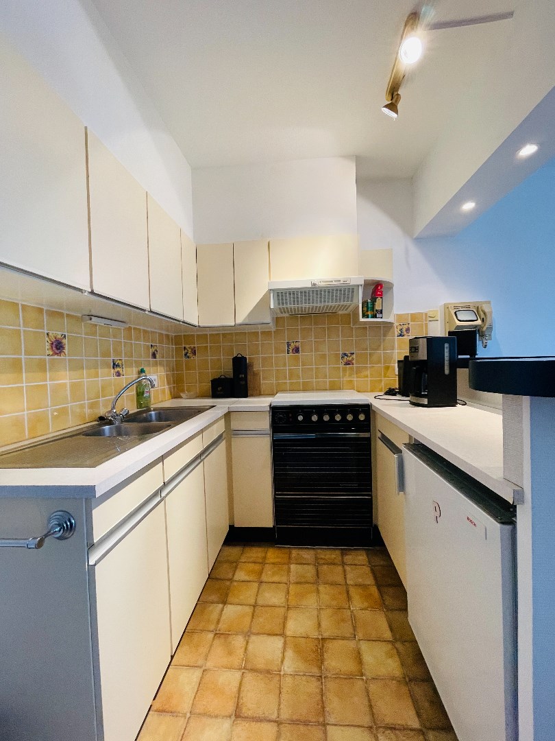 Ruime inkom, zuidgerichte woonkamer met open ingerichte keuken, slaaphoek met bergkast, badkamer met douche, wastafel en toilet en een privatieve parkeerplaats in de residentie.
