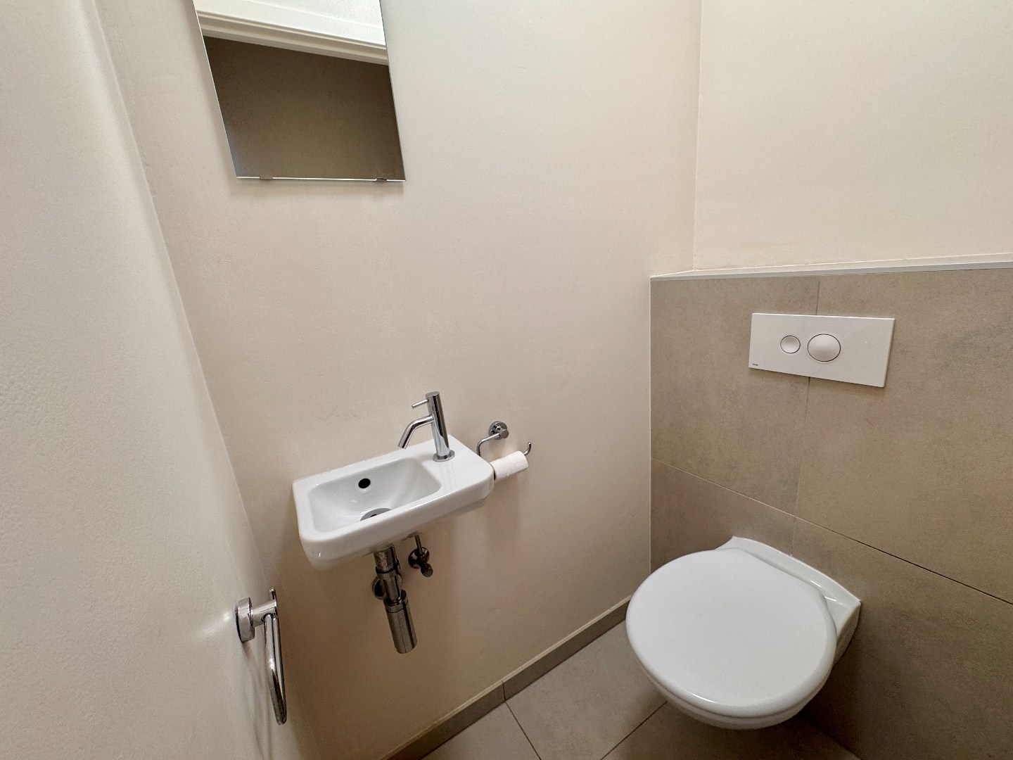 Inkomhal, lichtrijke woonkamer, open en ingerichte keuken met berging en aansluiting voor de wasmachine, badkamer met douche en wastafel, apart toilet, twee slaapkamers met terras en garage.