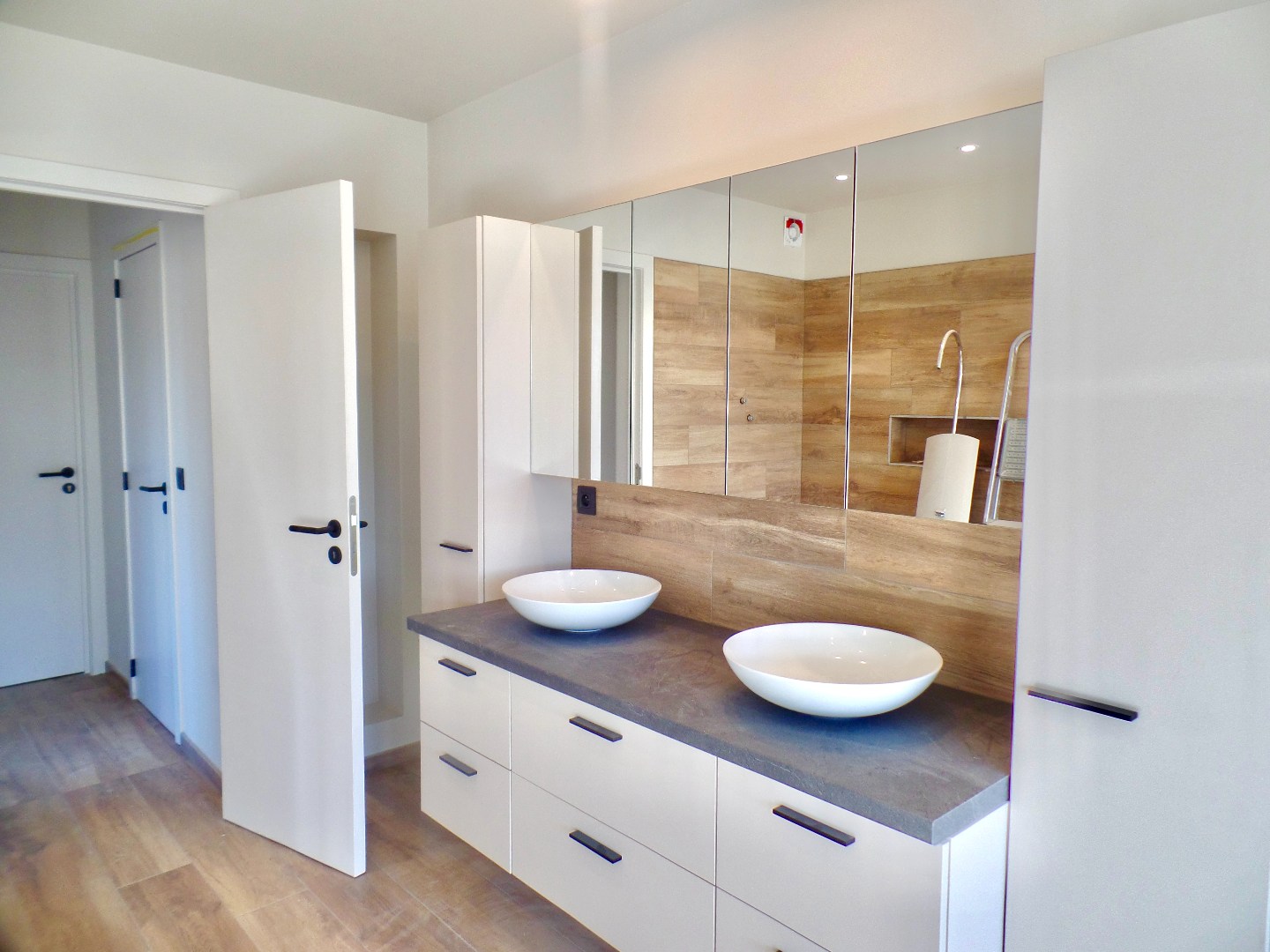 Inkomhal, ruime woonkamer, ingerichte keuken, drie slaapkamers waarvan twee op de verdieping, badkamer met bad, inloopdouche en dubbele wastafel, twee toiletten en berging.
