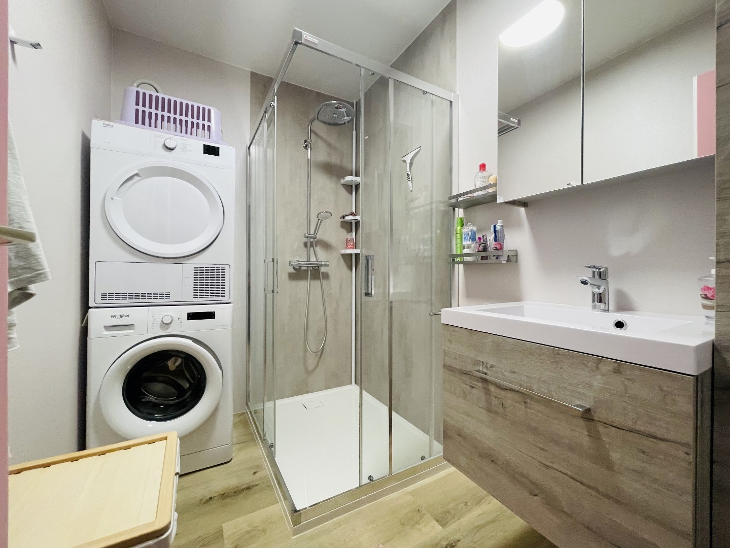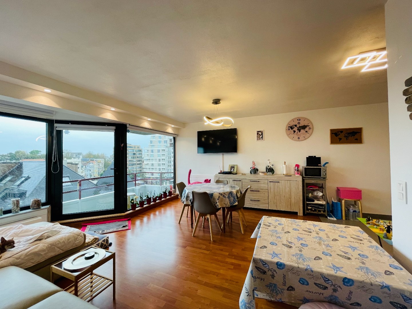 Inkom, ruime woonkamer met mooi open zicht op de markt en zongericht balkon, ingerichte open keuken, 1 grote slaapkamer (± 15,30m²), badkamer met inloopdouche, wastafel en aansluiting voor wasmachine en droogkast, een apart toilet en een privatieve kelder.
