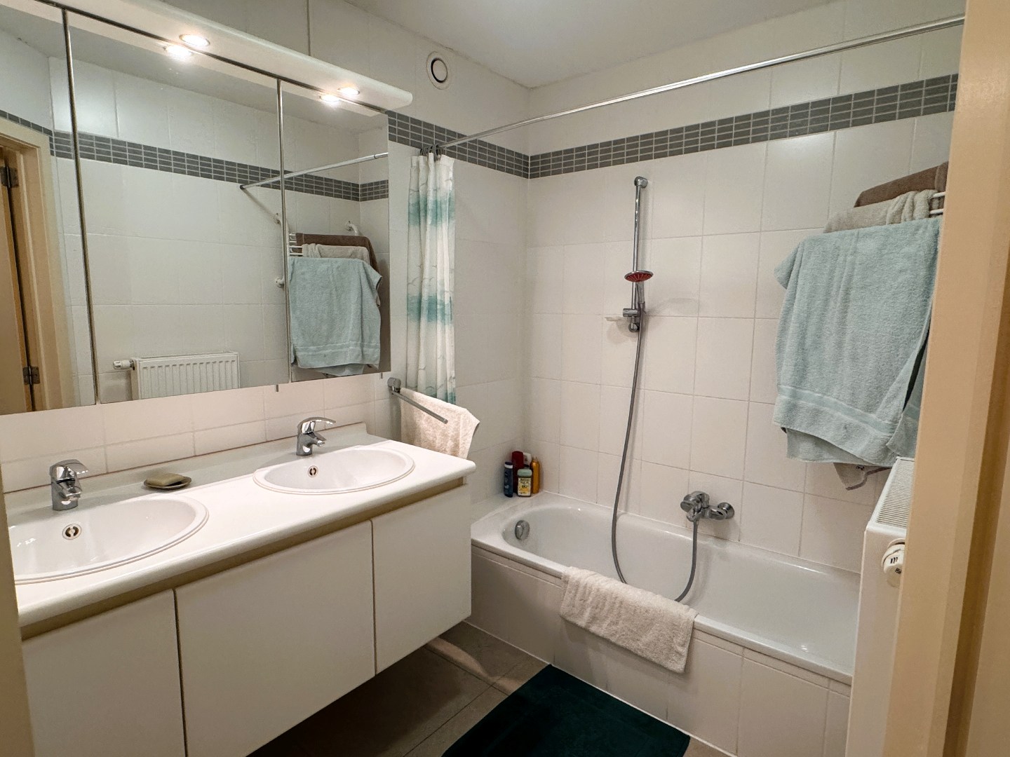 Inkomhal, lichtrijke woonkamer met terras, open en ingerichte keuken met berging, badkamer met dubbele wastafel en ligbad, apart toilet en twee slaapkamers.