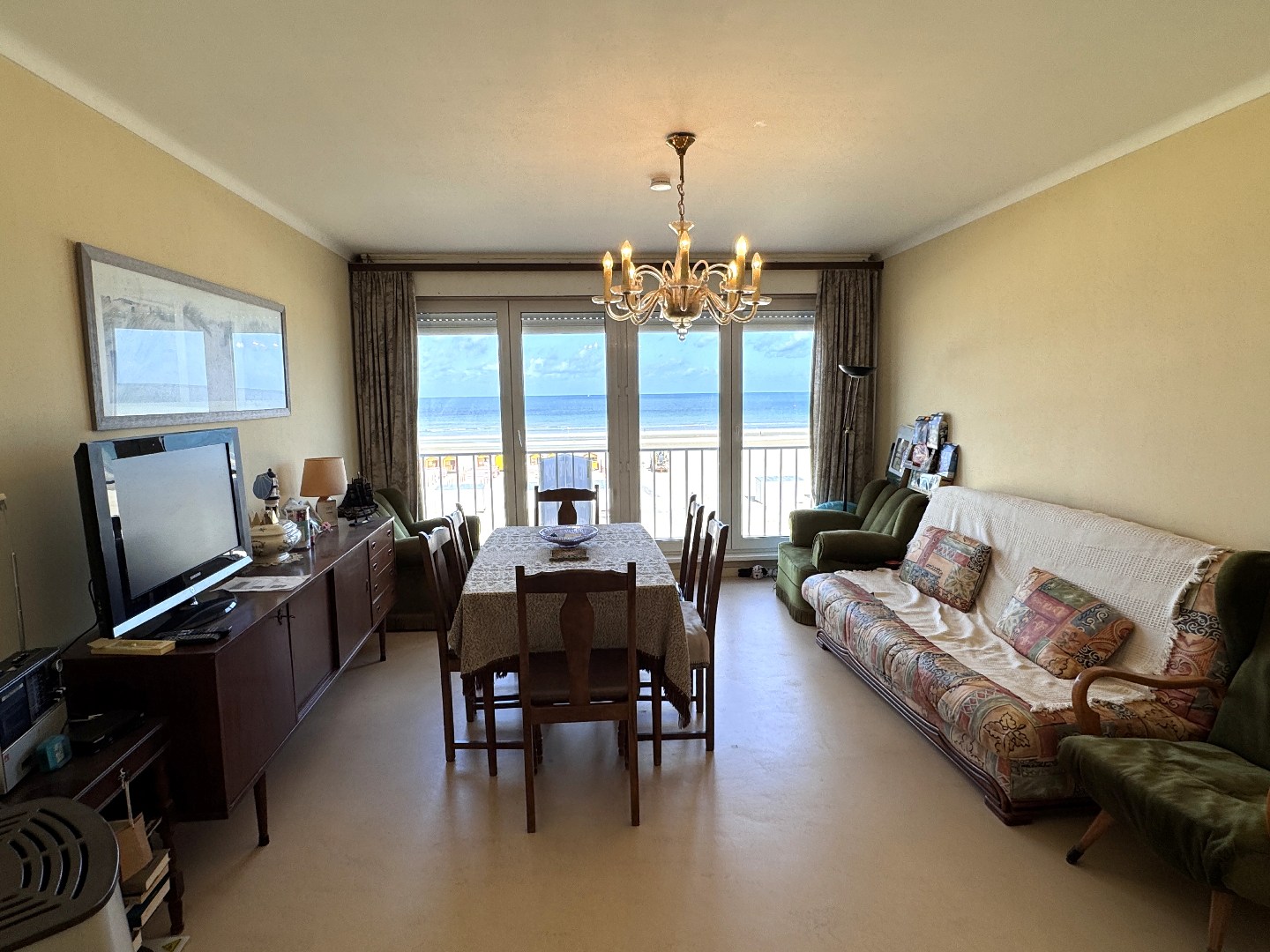 Bemeubeld appartement met frontaal zeezicht, vlakbij de winkelstraat en het openbaar vervoer.