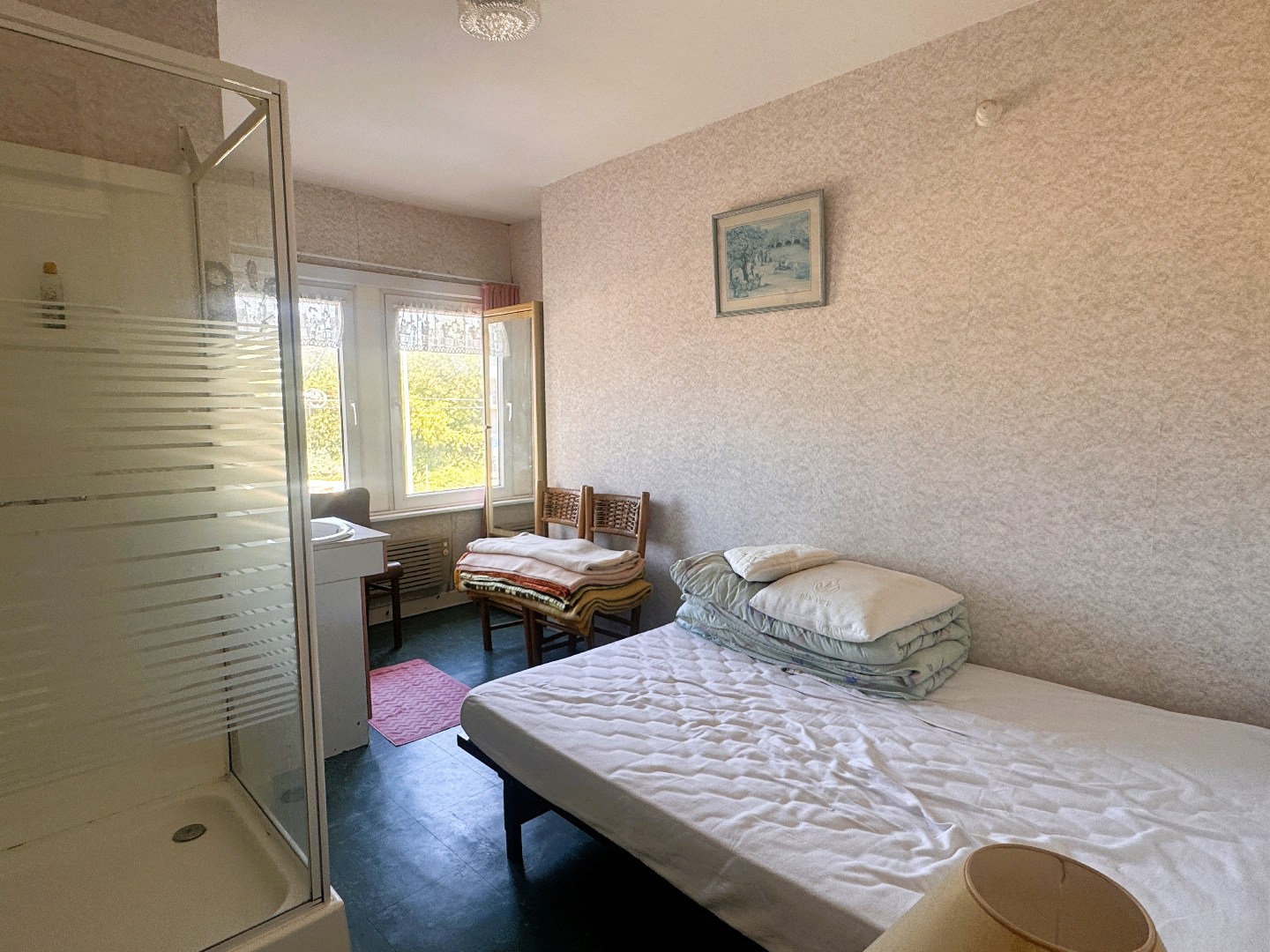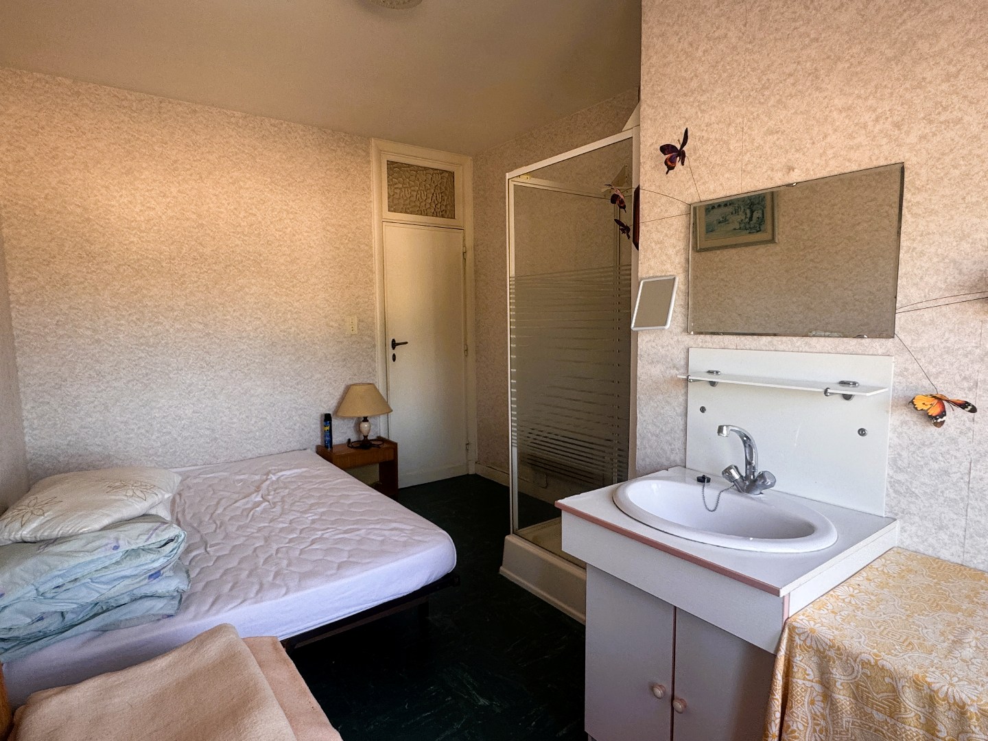 Inkomhal, woonkamer, keuken, twee slaapkamers met elk een wastafel waarvan één met een douche en een apart toilet.