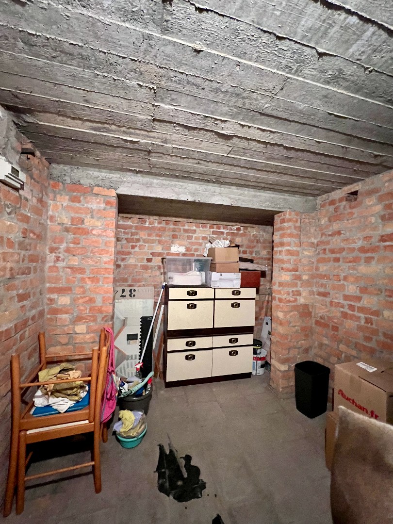 Inkomhal, lichtrijke woonkamer, keuken ingericht met toestellen, één slaapkamer, badkamer met wastafel, douche en toilet en berging in de kelderverdieping.