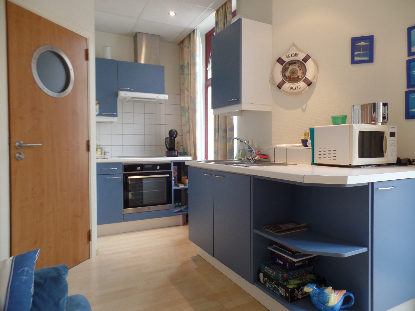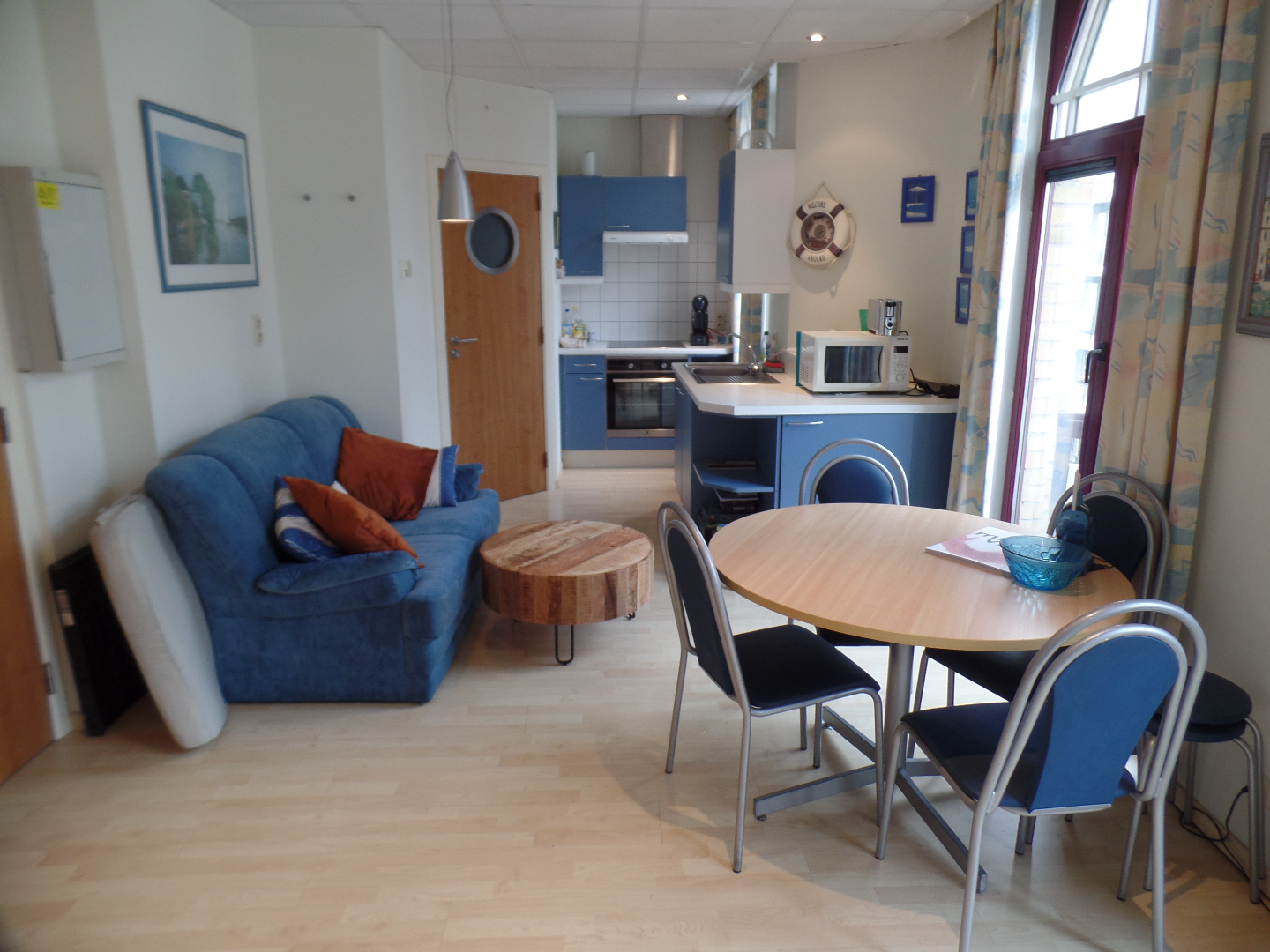 Woonkamer met open ingerichte keuken en 2 BALKONS en een badkamer met douche, wastafel en toilet.