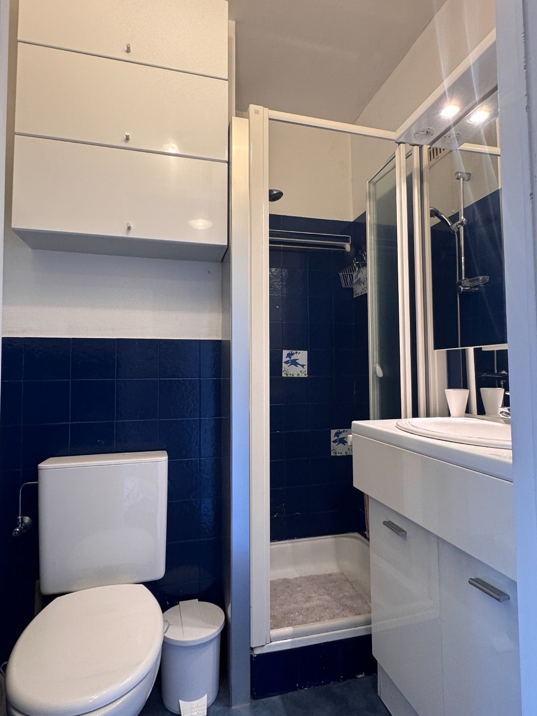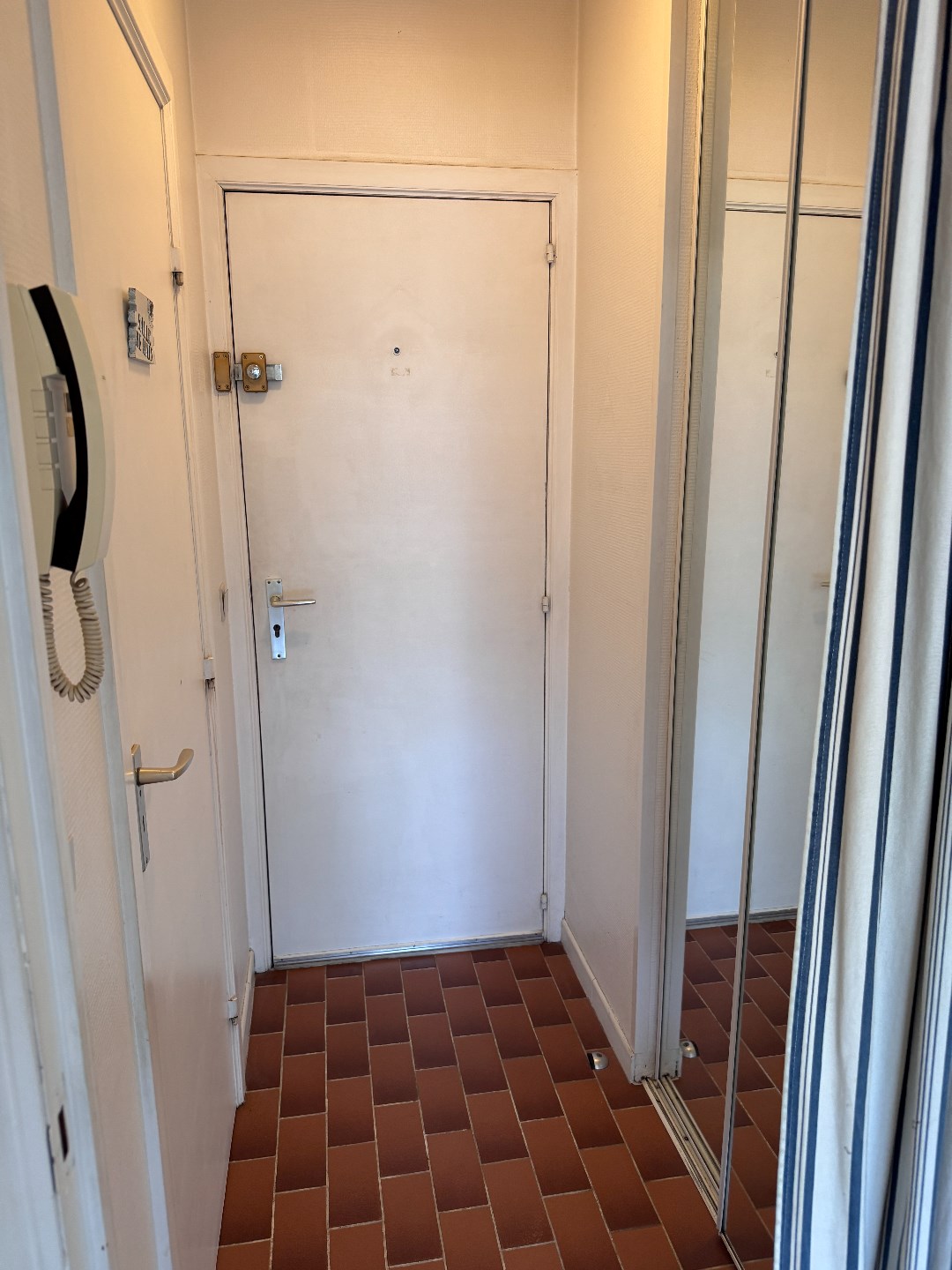 Inkomhal met vestiaire, woonkamer met een zuidgericht terras, open keuken, badkamer met douche, wastafel en toilet en een privatieve kelder.
