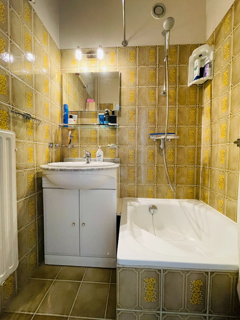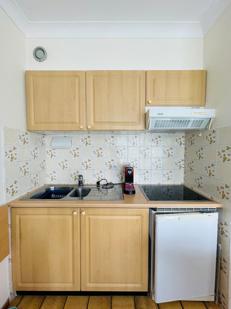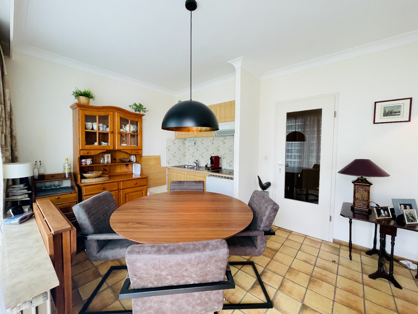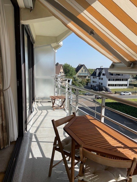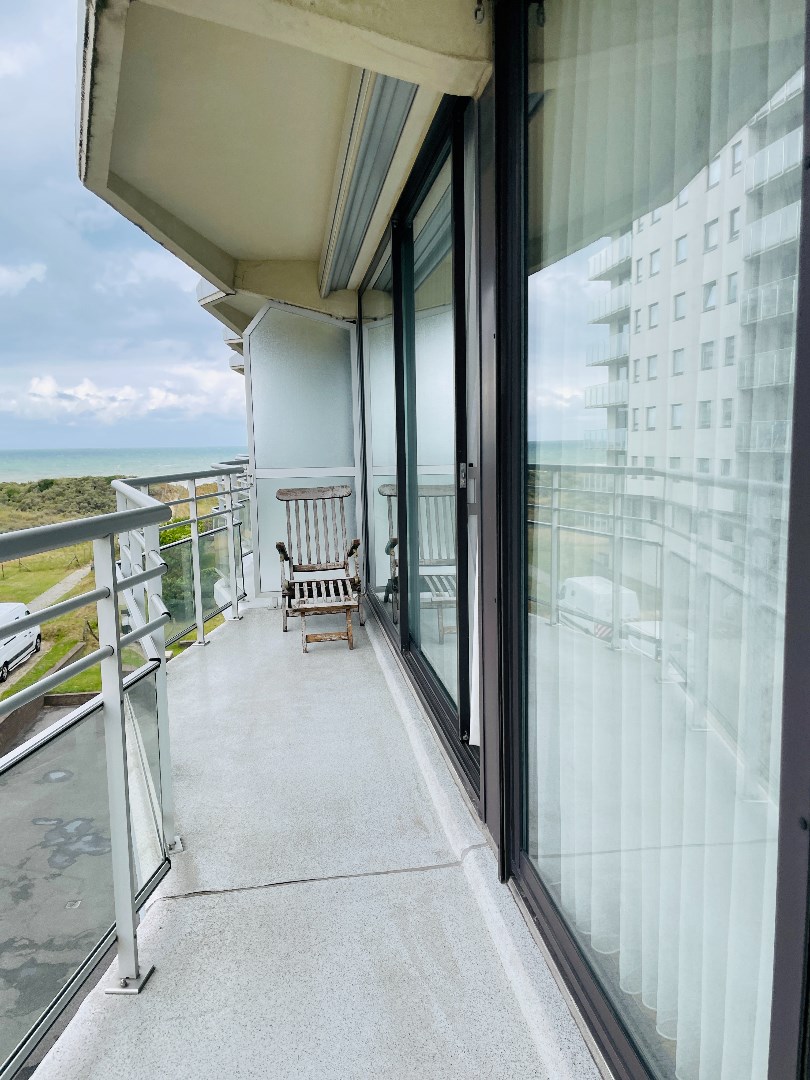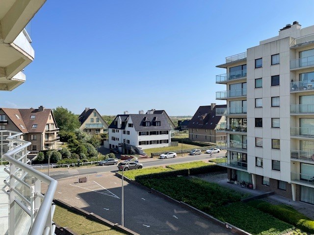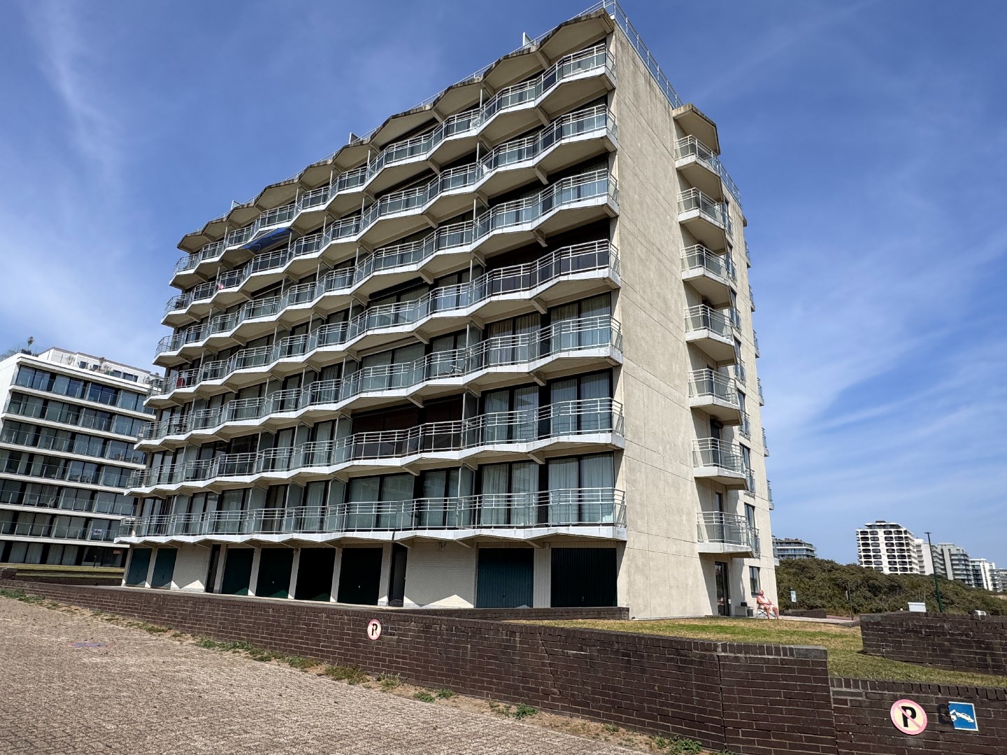 Ruime inkomhal met opklapbaar stapelbed, lichtrijke woonkamer met open keuken, zongericht terras met zeezicht en zonnewering, badkamer met ligbad en wastafel, apart toilet, bergkast in de kelderverdieping en een parking in het gebouw