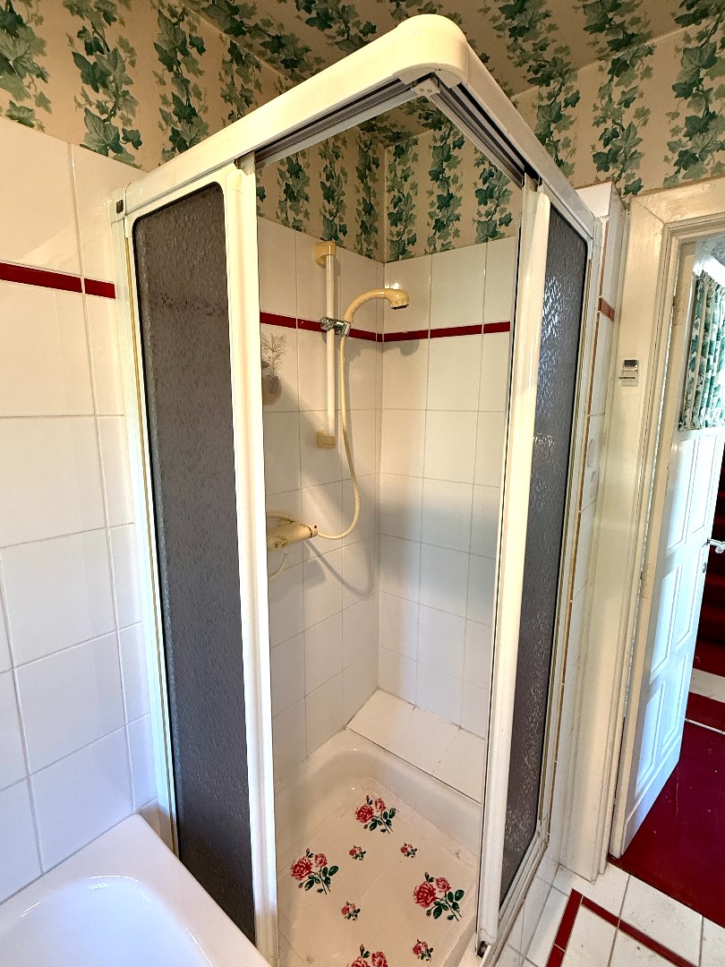 Tussenverdiep: 2 slaapkamers en een badkamer met ligbad, douche wastafel en toilet.