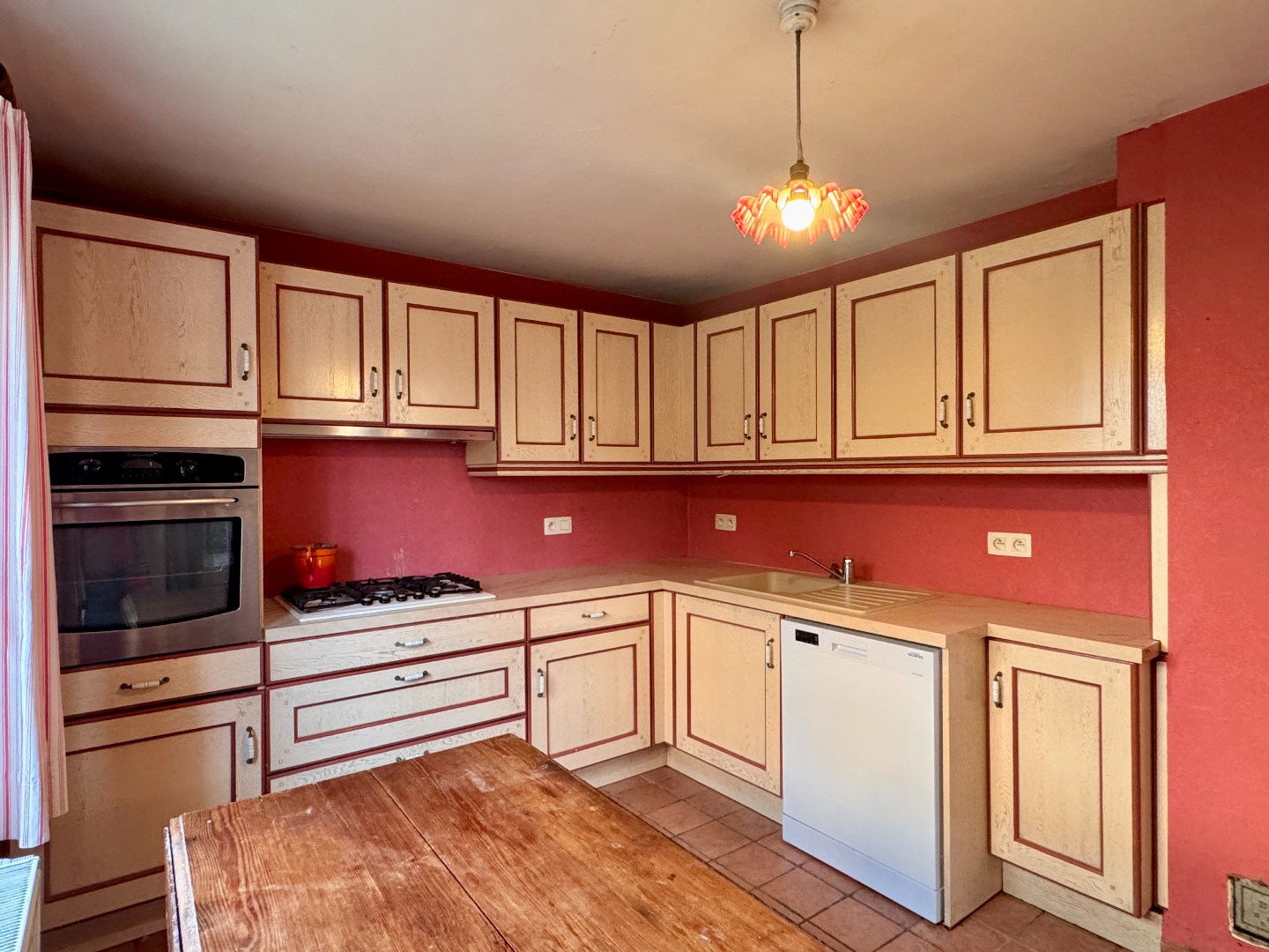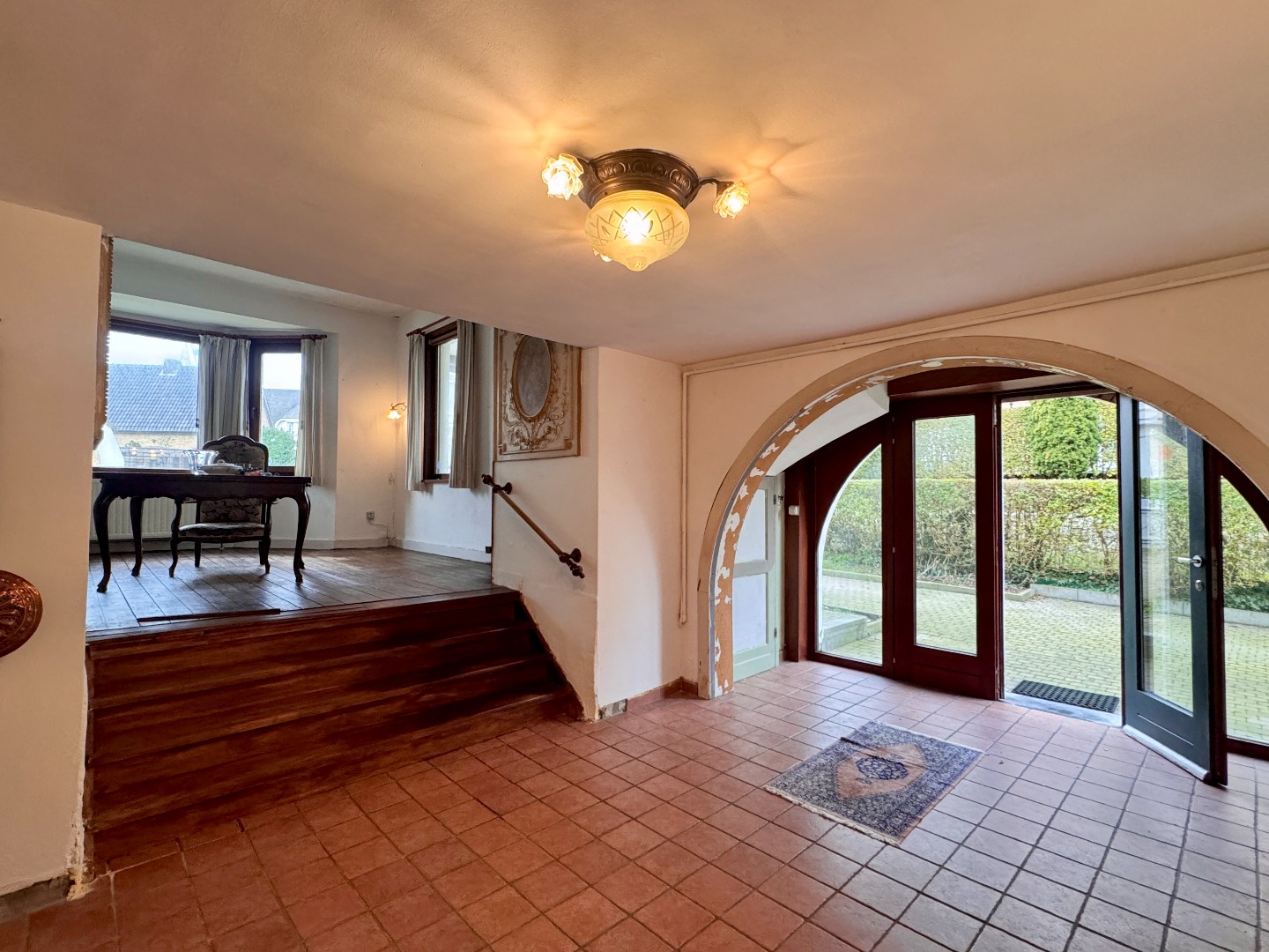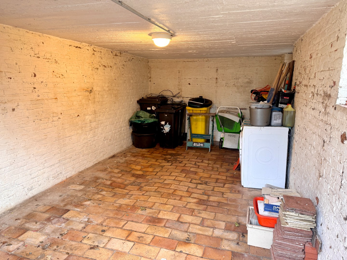 Gelijkvloers: inkom, woonkamer, eetkamer, keuken, apart toilet en berging met toegang tot de tuin en garage.